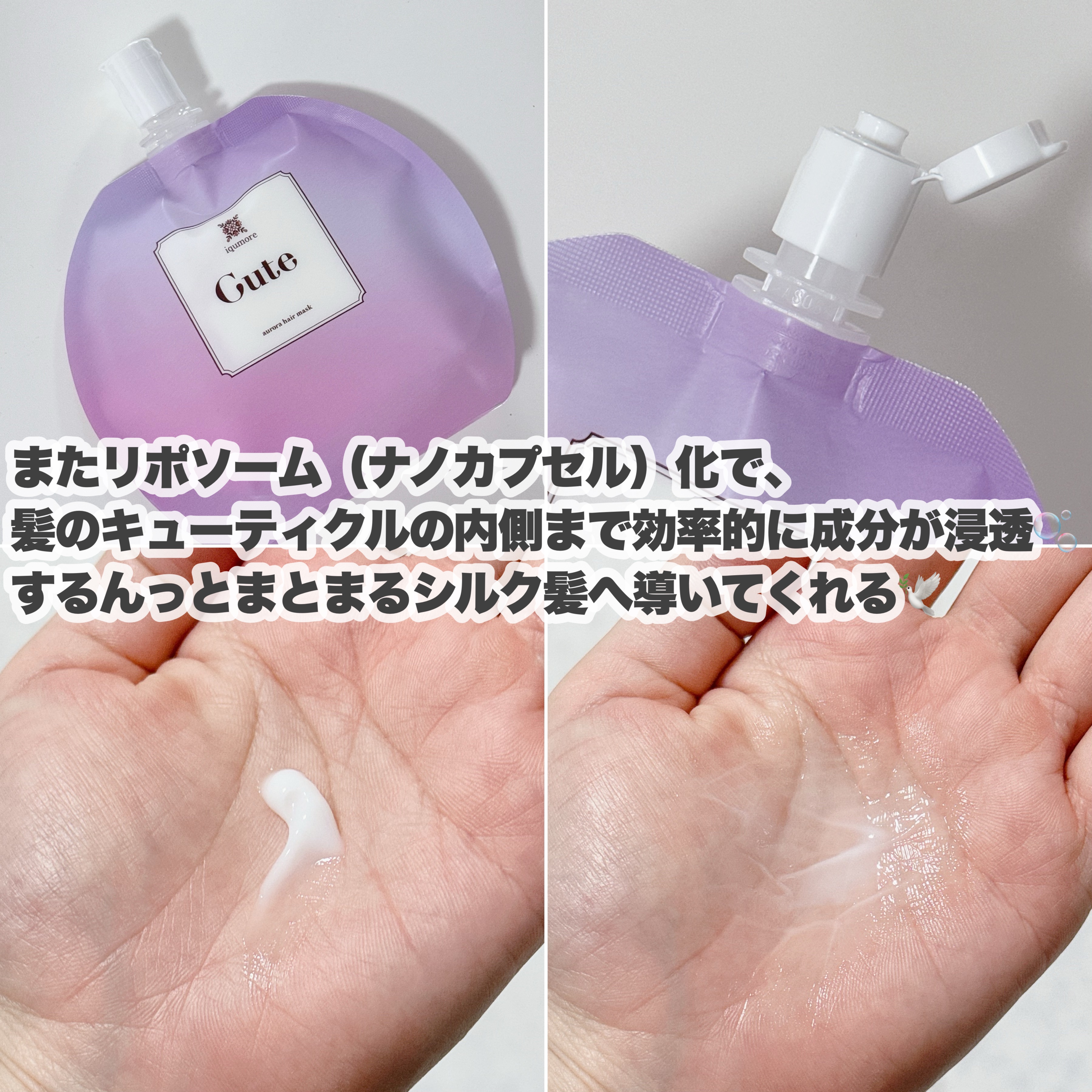 96.5%が天然由来成分でできており 7つの無添加処方で頭皮環境や髪の毛のコンディションをやさしく整えてくれる 独自の超微粒子化技術「ナノ化」により美容成分を含んだ乳化粒子がナノサイズまで小さくなっているため ミルクとオイルのWアプローチで一日中うるふわシルク髪へと導いてくれるよ☝🏻