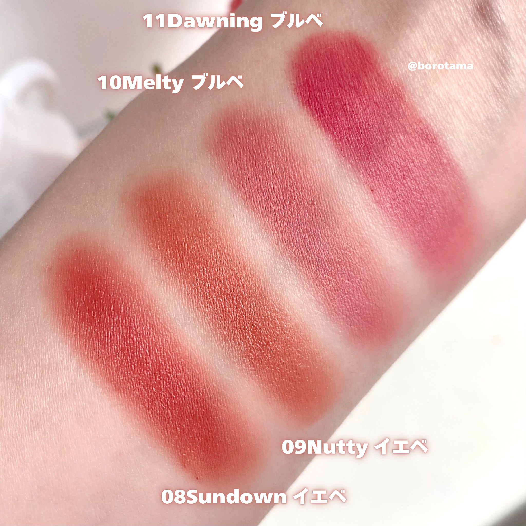 - <02 PEAK(ピーク)> ジメチコン、ジメチコンクロスポリマー、シリカ、イソノナン酸イソノニル、パラフィン、合成フルオロフロゴパイト、リンゴ酸ジイソステアリル、酸化チタン、リンゴ種子油、トリイソステアリン酸ポリグリセリル-2、ツバキ種子油、セチルPEG/PPG-10/1ジメチコン、イソステアリン酸ソルビタン、(セバシン酸/イソパルミチン酸)ジグリセリル、(ビニルジメチコン/メチコンシルセスキオキサン)クロスポリマー、ポリヒドロキシステアリン酸、マイクロクリスタリンワックス、ジステアルジモニウムヘクトライト、レシチン、ジイソステアリン酸ポリグリセリル-2、パルミチン酸エチルヘキシル、ミリスチン酸イソプロピル、イソステアリン酸、ポリリシノレイン酸ポリグリセリル-3、クエン酸トリエチル、(ラズベリー種子油/コハク酸トコフェロール)アミノプロパンジオールエステルズ、トコフェロール、ブドウ種子油、BG、水、グリセリン、シロバナワタ種子エキス、香料、酸化鉄、赤202、黄4、赤227、赤201 <03 MUVE(ミューブ)> ジメチコン、ジメチコンクロスポリマー、シリカ、パラフィン、合成フルオロフロゴパイト、リンゴ酸ジイソステアリル、酸化チタン、イソノナン酸イソノニル、リンゴ種子油、トリイソステアリン酸ポリグリセリル-2、ツバキ種子油、セチルPEG/PPG-10/1ジメチコン、イソステアリン酸ソルビタン、(セバシン酸/イソパルミチン酸)ジグリセリル、(ビニルジメチコン/メチコンシルセスキオキサン)クロスポリマー、ポリヒドロキシステアリン酸、マイクロクリスタリンワックス、ジステアルジモニウムヘクトライト、レシチン、ジイソステアリン酸ポリグリセリル-2、パルミチン酸エチルヘキシル、ミリスチン酸イソプロピル、イソステアリン酸、ポリリシノレイン酸ポリグリセリル-3、クエン酸トリエチル、(ラズベリー種子油/コハク酸トコフェロール)アミノプロパンジオールエステルズ、トコフェロール、ブドウ種子油、BG、水、グリセリン、シロバナワタ種子エキス、香料、酸化鉄、黄4、赤202、青1、赤201 <05 LESSENING(レスニング)> ジメチコン、ジメチコンクロスポリマー、シリカ、リンゴ酸ジイソステアリル、酸化チタン、パラフィン、合成フルオロフロゴパイト、リンゴ種子油、トリイソステアリン酸ポリグリセリル-2、イソノナン酸イソノニル、ツバキ種子油、セチルPEG/PPG-10/1ジメチコン、イソステアリン酸ソルビタン、(セバシン酸/イソパルミチン酸)ジグリセリル、(ビニルジメチコン/メチコンシルセスキオキサン)クロスポリマー、ポリヒドロキシステアリン酸、マイクロクリスタリンワックス、ジステアルジモニウムヘクトライト、レシチン、パルミチン酸エチルヘキシル、ミリスチン酸イソプロピル、イソステアリン酸、ポリリシノレイン酸ポリグリセリル-3、クエン酸トリエチル、ジイソステアリン酸ポリグリセリル-2、(ラズベリー種子油/コハク酸トコフェロール)アミノプロパンジオールエステルズ、トコフェロール、ブドウ種子油、BG、水、グリセリン、シロバナワタ種子エキス、香料、酸化鉄、赤227、黄4、赤202 <07 HEARTY(ハーティ)> ジメチコン、ジメチコンクロスポリマー、シリカ、パラフィン、イソノナン酸イソノニル、合成フルオロフロゴパイト、リンゴ酸ジイソステアリル、酸化チタン、リンゴ種子油、トリイソステアリン酸ポリグリセリル-2、ツバキ種子油、セチルPEG/PPG-10/1ジメチコン、イソステアリン酸ソルビタン、(セバシン酸/イソパルミチン酸)ジグリセリル、(ビニルジメチコン/メチコンシルセスキオキサン)クロスポリマー、ポリヒドロキシステアリン酸、マイクロクリスタリンワックス、ジステアルジモニウムヘクトライト、レシチン、ジイソステアリン酸ポリグリセリル-2、パルミチン酸エチルヘキシル、ミリスチン酸イソプロピル、イソステアリン酸、ポリリシノレイン酸ポリグリセリル-3、クエン酸トリエチル、(ラズベリー種子油/コハク酸トコフェロール)アミノプロパンジオールエステルズ、トコフェロール、ブドウ種子油、BG、水、グリセリン、シロバナワタ種子エキス、香料、黄5、酸化鉄、赤202、赤201、青1 <10 MELTY(メルティ)> ジメチコン、ジメチコンクロスポリマー、シリカ、リンゴ酸ジイソステアリル、酸化チタン、パラフィン、合成フルオロフロゴパイト、リンゴ種子油、トリイソステアリン酸ポリグリセリル-2、ツバキ種子油、セチルPEG/PPG-10/1ジメチコン、イソステアリン酸ソルビタン、(セバシン酸/イソパルミチン酸)ジグリセリル、イソノナン酸イソノニル、(ビニルジメチコン/メチコンシルセスキオキサン)クロスポリマー、ポリヒドロキシステアリン酸、マイクロクリスタリンワックス、ジステアルジモニウムヘクトライト、レシチン、パルミチン酸エチルヘキシル、ミリスチン酸イソプロピル、イソステアリン酸、ジイソステアリン酸ポリグリセリル-2、ポリリシノレイン酸ポリグリセリル-3、クエン酸トリエチル、(ラズベリー種子油/コハク酸トコフ