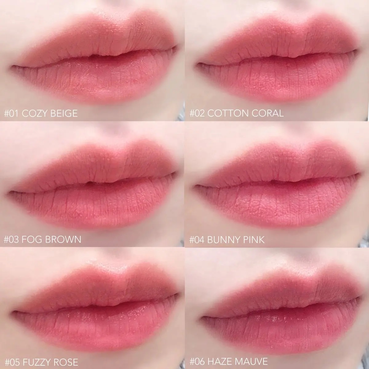 大人気うるツヤリップのハニーメルティングリップからマットタイプが誕生♡ びっくりするほどなめらかな雲のようなテクスチャーで唇を優しくぼかせるソフトブローリップなのでマットだけどふわっとしてて可愛い💓 クリームみたいな心地よい使用感✨ 乾燥した唇の角質やしわもカバーしてくれる効果が👏🏻 ミュートカラーでベースからメインカラー、チークにも使える万能リップ✨