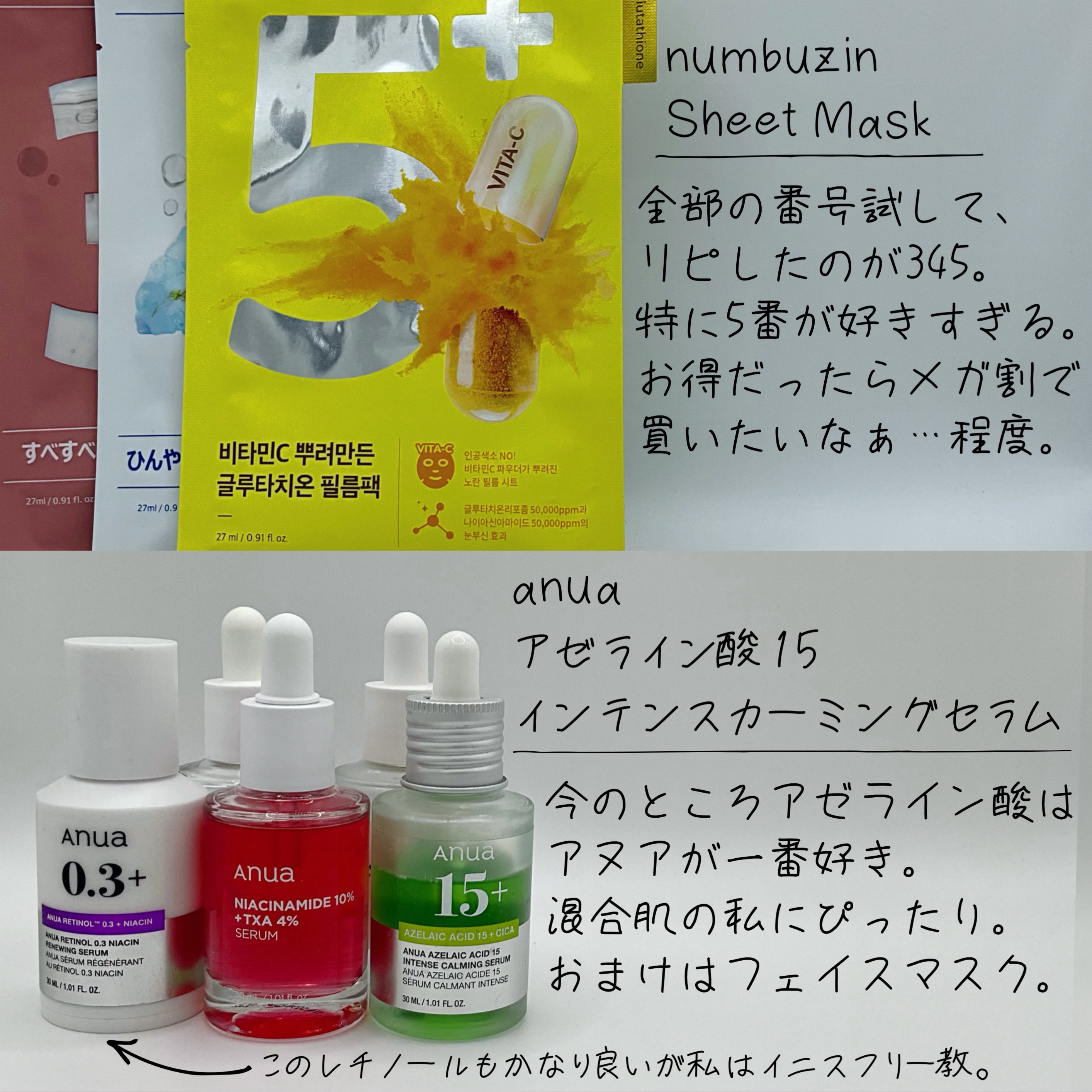 魔女工場Galac Niacin 2.0 Essence自費購入→今回のメガ割で購入予定○しゃばしゃば系○ナイアシンアミド高配合○ベタつきや匂いがない COSRXThe Vitamin C 23 Serum案件で頂き半分使用○冷蔵庫保存必須○ビタミンC23%○毛穴の引き締め効果○肌への刺激が強め AnuaHeartleaf 80 moisture soothing ample案件で頂き使い切り→リピ済み○保湿力抜群○ドクダミの沈静効果○コスパ◎ NATURE REPUBLICDark Spot Serum案件で頂き8割使用済み○低刺激なビタミンC○保湿力も高い○トラネキサム酸配合