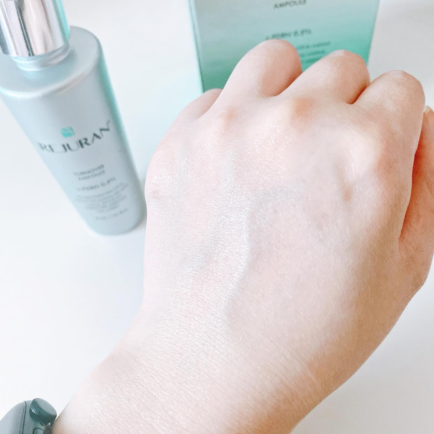 こちらの商品は、肌の28日サイクルを健康に保つターンオーバーアンプルだそうです♪ リジュランにはサーモンの活性DNAから抽出した独自成分のc-PDRNが配合されており、肌リズムを整え、健やかな肌へと導いてくれるそうです💕 美容液はとろみのあるとろっとした液体で、すーっとお肌に伸びました✨