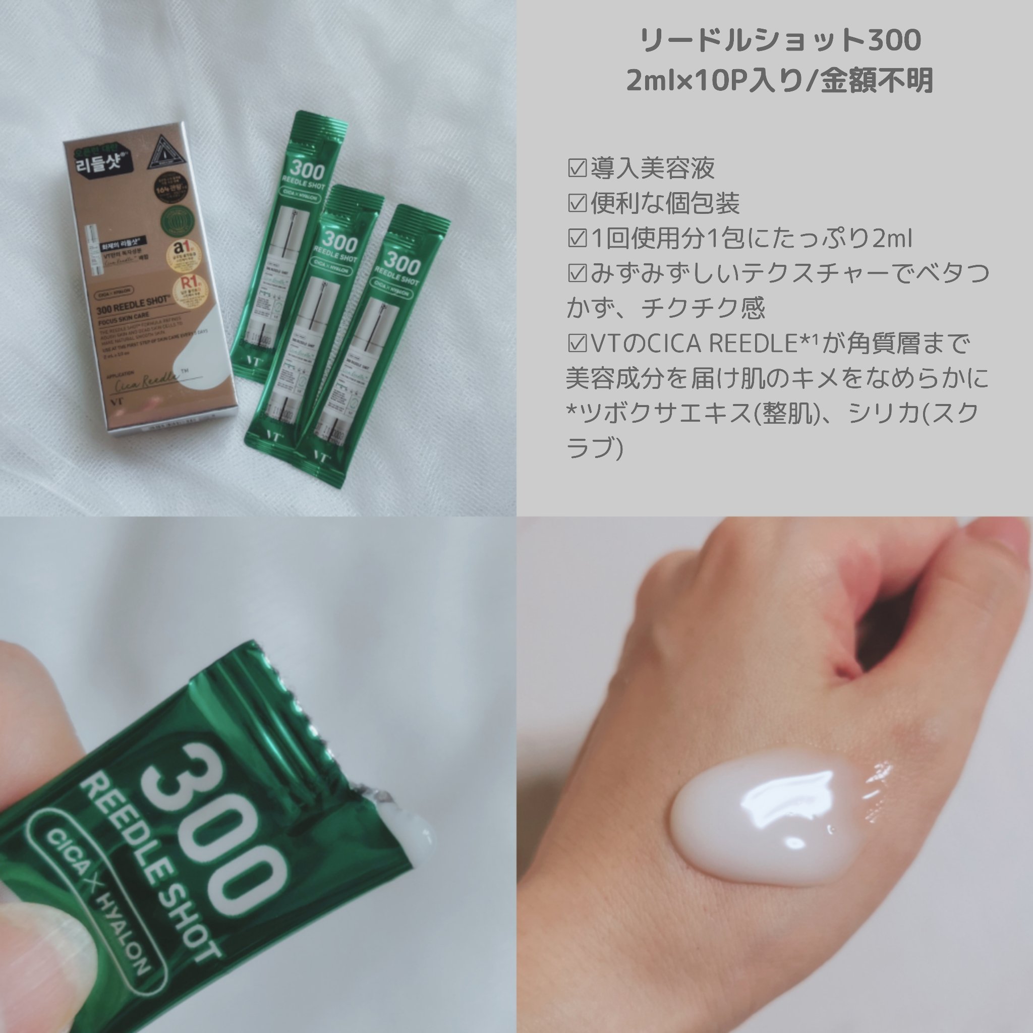 トナーはサラッとしていているけど保湿力がありました。トラネキサム酸が入っているので肌のくすみやニキビ跡をケアしてくれます。 エッセンスは若干とろみがあるテクスチャーでトーニングトナーと合わせて使うとより効果があると思います◎ リードルショット 300はチクチク痛みがありますが使用していくうちに慣れてきます。パウチなので持ち運びに便利でした♡
