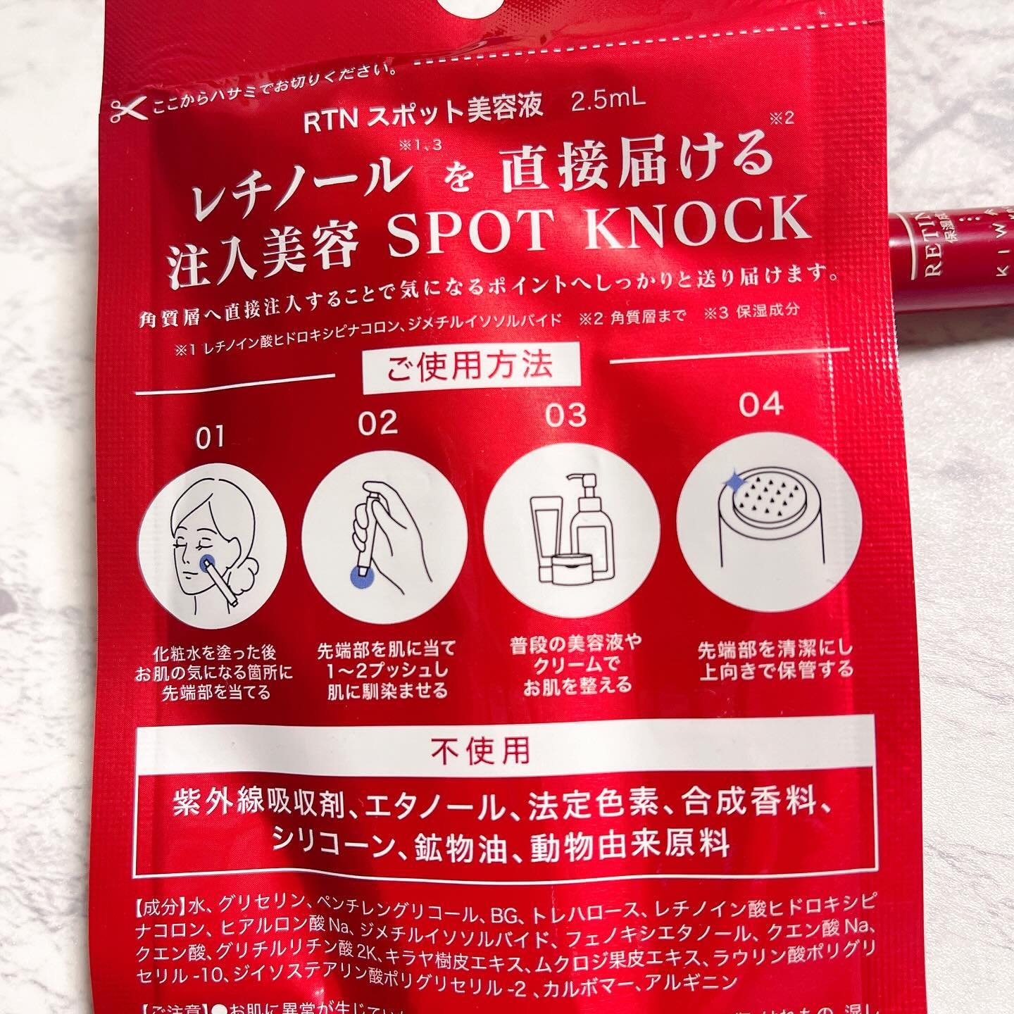 - <2.5mL> 水、グリセリン、ペンチレングリコール、BG、トレハロース、レチノイン酸ヒドロキシピナコロン ヒアルロン酸Na、ジメチルイソソルバイド、フェノキシエタノール、クエン酸Na、クエン酸、グリチルリチン酸2 K、キラヤ樹皮エキス、ムクロジ果皮エキス、ラウリン酸ポリグリセリル-10、ジイソステアリン酸ポリグリセリル-2、カルボマー、アルギニン