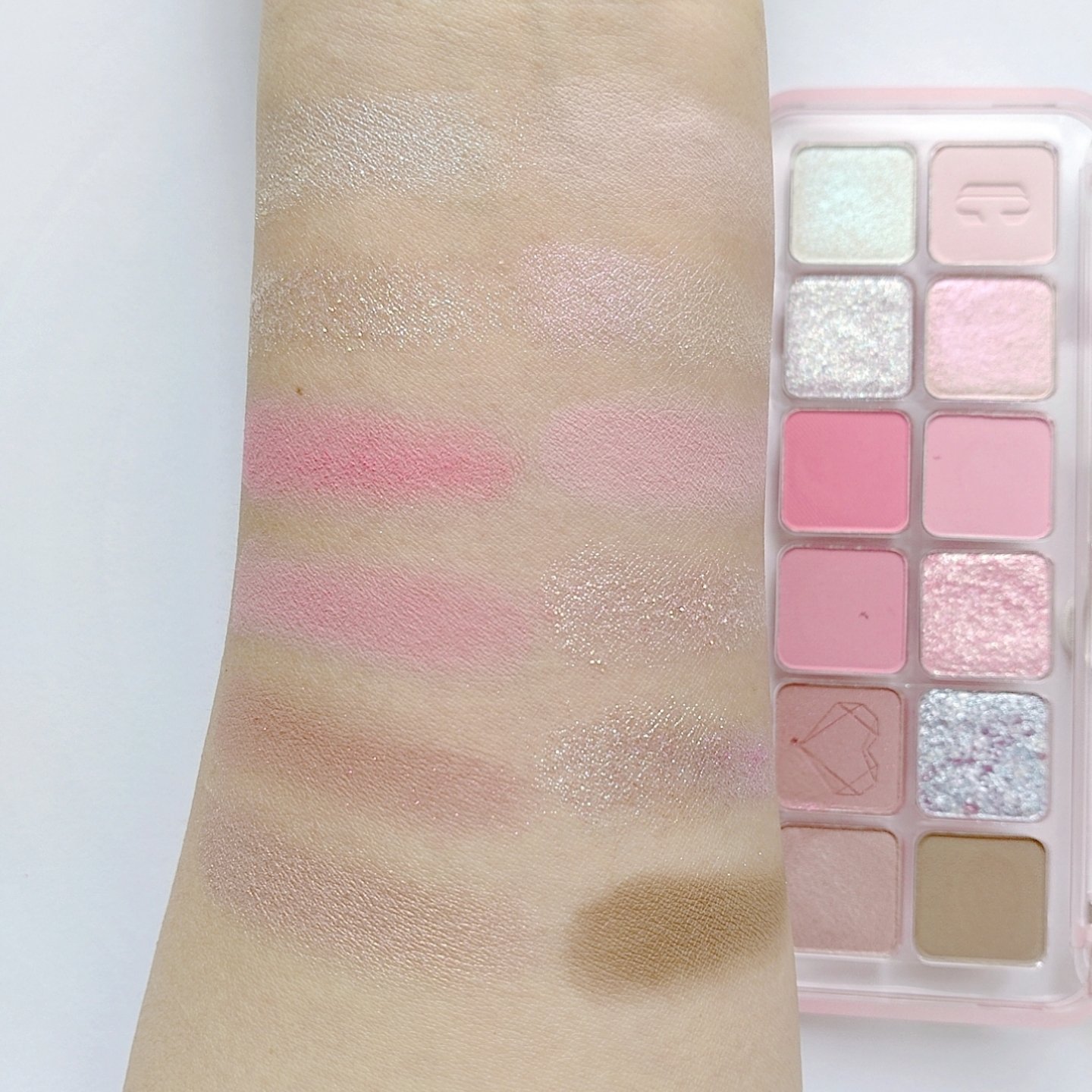 プチプラのクオリティじゃないっ!! 発売前からチェックしていたけれど、ここまで可愛いとは…😆 絶妙カラーで目もとのくすみを飛ばして*明るい印象に🩷 横割りグラデーションでメイクし、立体感をより出したかったので最後に1番左のカラーを上まぶたの真ん中と涙袋にのせています🙆 肌馴染みも良くて粉飛びも感じにくかったです💕 ブラウンの方も店頭に出てたら買おうかな💓