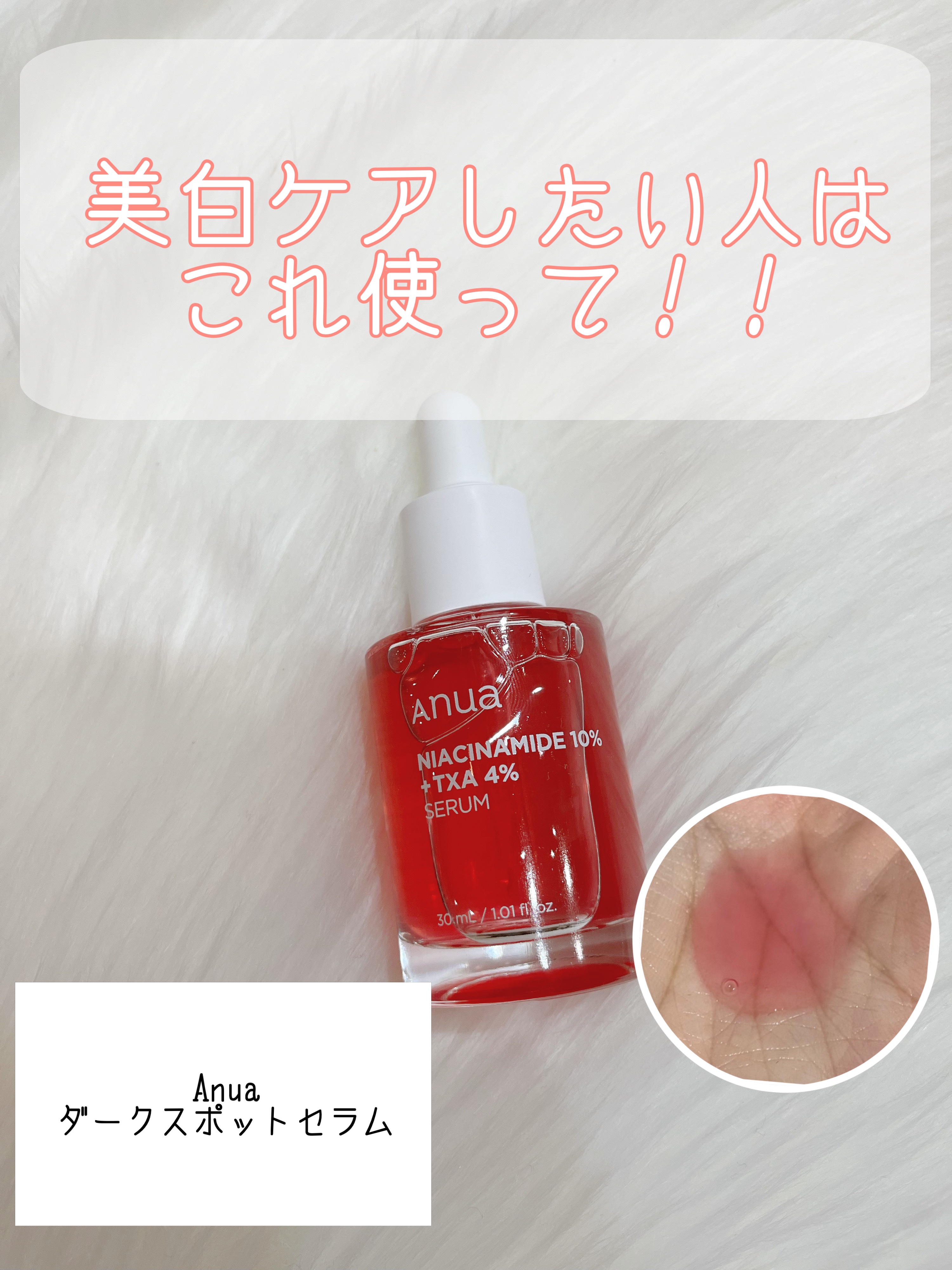 配合成分がとっても豪華👏🏻ナイアシンアミド10%、トラネキサム酸4%、アルブチン2%配合Anua@anua.jpダークスポットセラム🎈アヌアのカラフルな美容液たち水色セラムも桃色セラムも良かったけどくすみが悩みなので、赤色セラムも一押し...