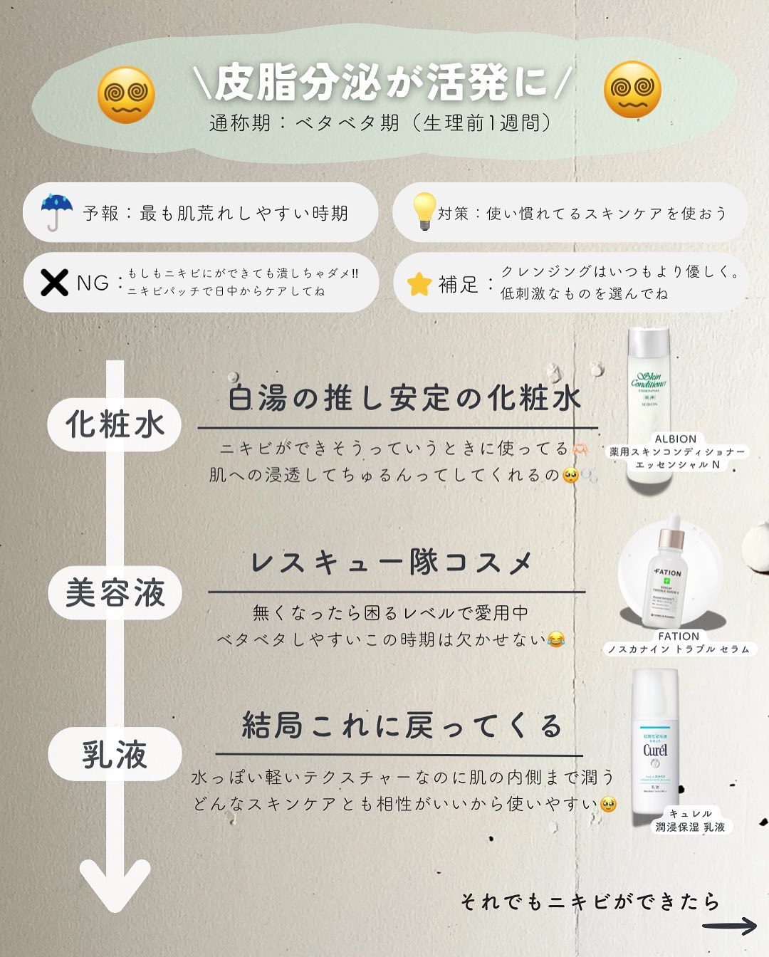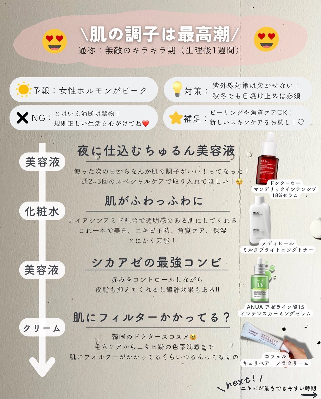 生理周期に合わせたスキンケア!フォロワーさんの中にも「繰り返すニキビがしぶとい」って何度も相談を受けていてやっとまとめられたよ~!!! 無敵のキラキラ期ピーリングなど新しいスキンケア試しちゃおう グリチルグリチン酸ジカリウムなどが配合されたスキンケアで肌荒れを防ぐお手入れ!