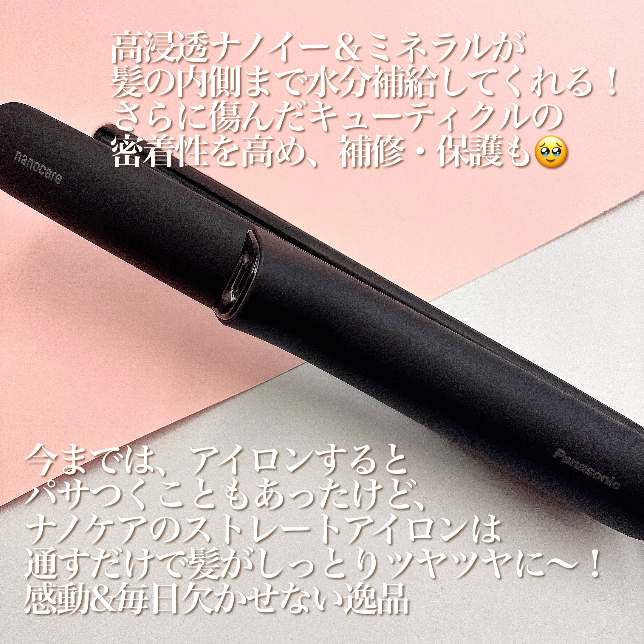 高浸透ナノイー&ミネラルが髪の内側まで水分補給。 さらに傷んだキューティクルの密着性を高め、補修・保護! ストレートアイロンのナノケア史上最高のうるおいで髪に。水分発生量が格段にアップした高浸透ナノイー搭載だから、髪のツヤとまとまりを実感できます。 パナソニックといえばナノケア✨ なんと高浸透ナノイーがヘアアイロンにも搭載🤡 髪の内側まで水分補給しながらしっとりツヤ髪へ導いてくれるよ!