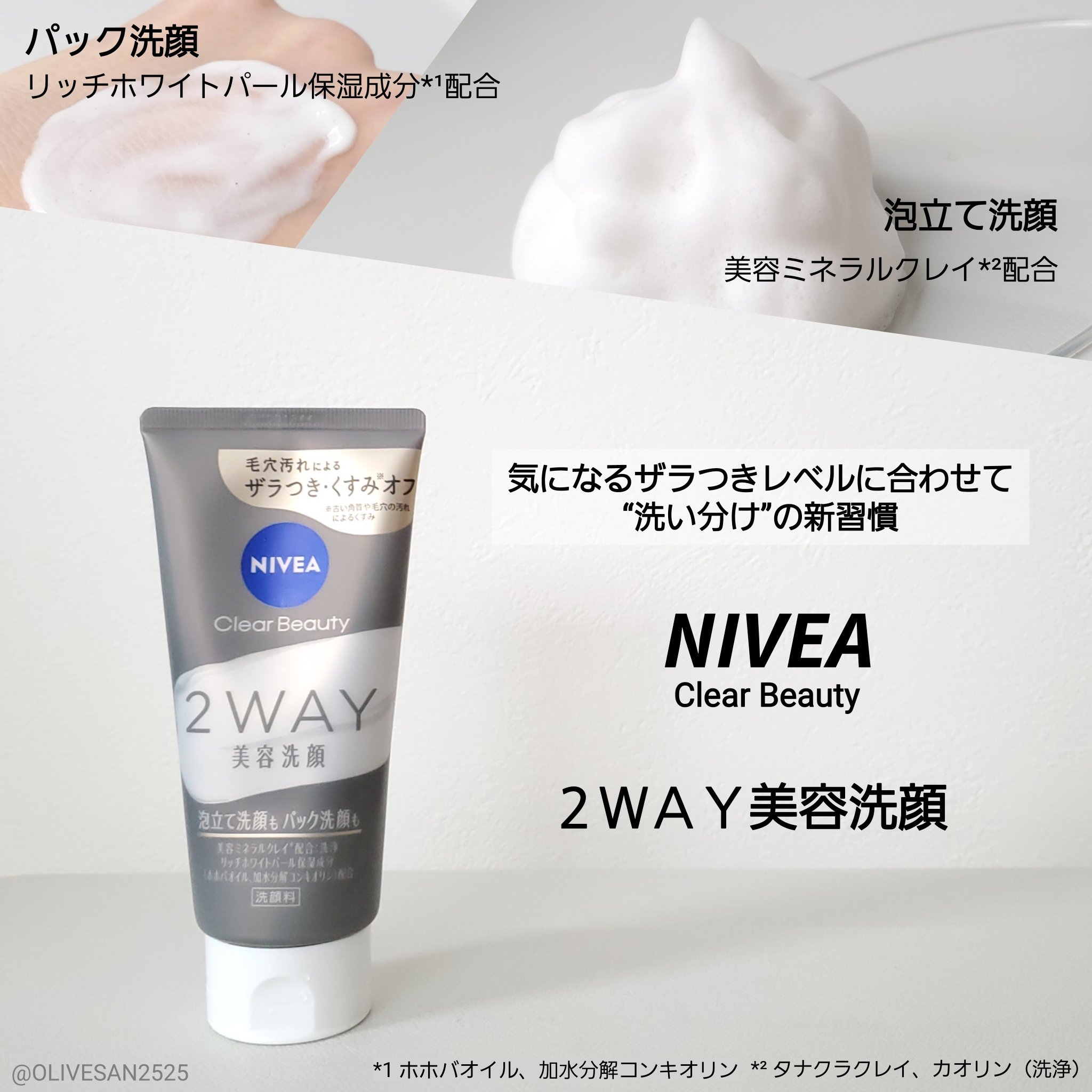 - ※商品名変更(旧名:ニベア クリアビューティー2WAY美容洗顔)に伴い、商品パッケージを順次リニューアル。尚、これにかかる商品の返品・交換は承っておりません。 気になるザラつきレベルに合わせて洗い分け。 毎日の汚れには泡でしっかり。 ザラつき気になる日はパックでごっそり。 古い角質を柔らかくほぐし、汚れを吸着する洗顔料。 毛穴汚れによるザラつき、くすみ*までさっぱり落とします。 透明感のある、毛穴の目立ちにくいつるんとなめらか肌へ。 ●美容ミネラルクレイ配合:タナクラクレイ、カオリン(洗浄) ●リッチホワイトパール保湿成分配合:ホホバオイル、加水分解コンキオリン *古い角質や毛穴の汚れによるくすみ