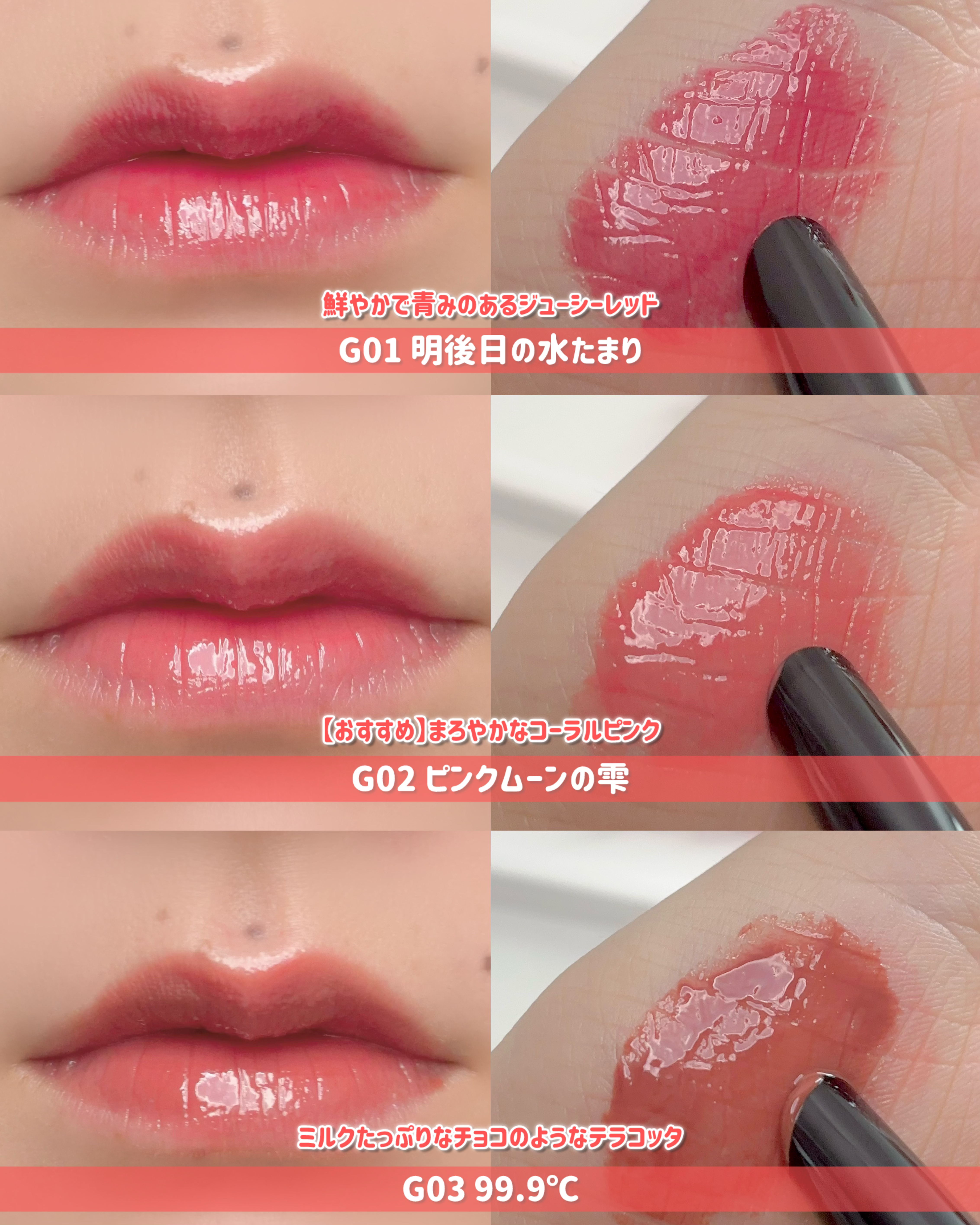 - <G01 明後日の水たまり> テトライソステアリン酸ジペンタエリスリチル、オクチルドデカノール、水添ポリイソブテン、トリ(カプリル酸/カプリン酸)グリセリル、ビスアルキル(C16-18)グリセリルウンデシルジメチコン、パラフィン、ダイマージリノール酸(フィトステリル/イソステアリル/セチル/ステアリル/ベヘニル)、ラウロイルグルタミン酸ジ(オクチルドデシル/フィトステリル/ベヘニル)、合成ワックス、マイクロクリスタリンワックス、ヒドロキシステアリン酸エチルヘキシル、トコフェロール、ホホバ種子油、オリーブ果実油、アーモンド油、ジメチコン、ヒアルロン酸Na、(+/-)ラウロイルアスパラギン酸Na、ラウロイルリシン、塩化亜鉛、酸化チタン、酸化鉄、水酸化Al、硫酸Ba、トリイソステアリン酸イソプロピルチタン、合成フルオロフロゴパイト、赤201、赤202 <G02 ピンクムーンの雫> テトライソステアリン酸ジペンタエリスリチル、オクチルドデカノール、水添ポリイソブテン、トリ(カプリル酸/カプリン酸)グリセリル、ビスアルキル(C16-18)グリセリルウンデシルジメチコン、パラフィン、ダイマージリノール酸(フィトステリル/イソステアリル/セチル/ステアリル/ベヘニル)、ラウロイルグルタミン酸ジ(オクチルドデシル/フィトステリル/ベヘニル)、合成ワックス、マイクロクリスタリンワックス、ヒドロキシステアリン酸エチルヘキシル、トコフェロール、ホホバ種子油、オリーブ果実油、アーモンド油、ジメチコン、ヒアルロン酸Na、(+/-)ラウロイルアスパラギン酸Na、ラウロイルリシン、塩化亜鉛、酸化チタン、酸化鉄、水酸化Al、硫酸Ba、トリイソステアリン酸イソプロピルチタン、合成フルオロフロゴパイト、赤201、赤202 <G03 99.9°C> テトライソステアリン酸ジペンタエリスリチル、オクチルドデカノール、水添ポリイソブテン、トリ(カプリル酸/カプリン酸)グリセリル、ビスアルキル(C16-18)グリセリルウンデシルジメチコン、パラフィン、ダイマージリノール酸(フィトステリル/イソステアリル/セチル/ステアリル/ベヘニル)、ラウロイルグルタミン酸ジ(オクチルドデシル/フィトステリル/ベヘニル)、合成ワックス、マイクロクリスタリンワックス、ヒドロキシステアリン酸エチルヘキシル、トコフェロール、ホホバ種子油、オリーブ果実油、アーモンド油、ジメチコン、ヒアルロン酸Na、(+/-)ラウロイルアスパラギン酸Na、ラウロイルリシン、塩化亜鉛、酸化チタン、酸化鉄、水酸化Al、硫酸Ba、トリイソステアリン酸イソプロピルチタン、合成フルオロフロゴパイト、赤201、赤202 <G04 スパイダー リリー調香師> テトライソステアリン酸ジペンタエリスリチル、オクチルドデカノール、水添ポリイソブテン、トリ(カプリル酸/カプリン酸)グリセリル、ビスアルキル(C16-18)グリセリルウンデシルジメチコン、パラフィン、ダイマージリノール酸(フィトステリル/イソステアリル/セチル/ステアリル/ベヘニル)、ラウロイルグルタミン酸ジ(オクチルドデシル/フィトステリル/ベヘニル)、合成ワックス、マイクロクリスタリンワックス、ヒドロキシステアリン酸エチルヘキシル、リンゴ酸ジイソステアリル、トコフェロール、ホホバ種子油、オリーブ果実油、アーモンド油、ジメチコン、ヒアルロン酸Na、(+/-)(チタン/酸化チタン)焼結物、ラウロイルアスパラギン酸Na、ラウロイルリシン、塩化亜鉛、酸化チタン、酸化鉄、水酸化Al、トリイソステアリン酸イソプロピルチタン、トリエトキシカプリリルシラン、合成フルオロフロゴパイト、青1、赤202 <G05 ピンク ロビンの泉> テトライソステアリン酸ジペンタエリスリチル、オクチルドデカノール、水添ポリイソブテン、トリ(カプリル酸/カプリン酸)グリセリル、ビスアルキル(C16-18)グリセリルウンデシルジメチコン、パラフィン、ダイマージリノール酸(フィトステリル/イソステアリル/セチル/ステアリル/ベヘニル)、ラウロイルグルタミン酸ジ(オクチルドデシル/フィトステリル/ベヘニル)、合成ワックス、マイクロクリスタリンワックス、ヒドロキシステアリン酸エチルヘキシル、リンゴ酸ジイソステアリル、トコフェロール、ホホバ種子油、オリーブ果実油、アーモンド油、ジメチコン、ヒアルロン酸Na、(+/-)(チタン/酸化チタン)焼結物、ラウロイルアスパラギン酸Na、ラウロイルリシン、塩化亜鉛、酸化チタン、酸化鉄、水酸化Al、トリイソステアリン酸イソプロピルチタン、トリエトキシカプリリルシラン、合成フルオロフロゴパイト、青1、赤202 <EX-1 哀愁の亡霊 (限定色)> テトライソステアリン酸ジペンタエリスリチル、オクチルドデカノール、水添ポリイソブテン、トリ(カプリル酸/カプリン酸)グリセリル、ビスアルキル(C16-18)グリセリルウンデシルジメチコン、パラフィン、ダイマージリノール酸(フィトステリル/イソステアリル/セチル/ステアリル/ベヘニル)、ラウロイルグルタミン酸ジ(オクチルドデシル/フィトステリル/ベヘニル)、合成ワックス、マイクロクリスタリンワックス