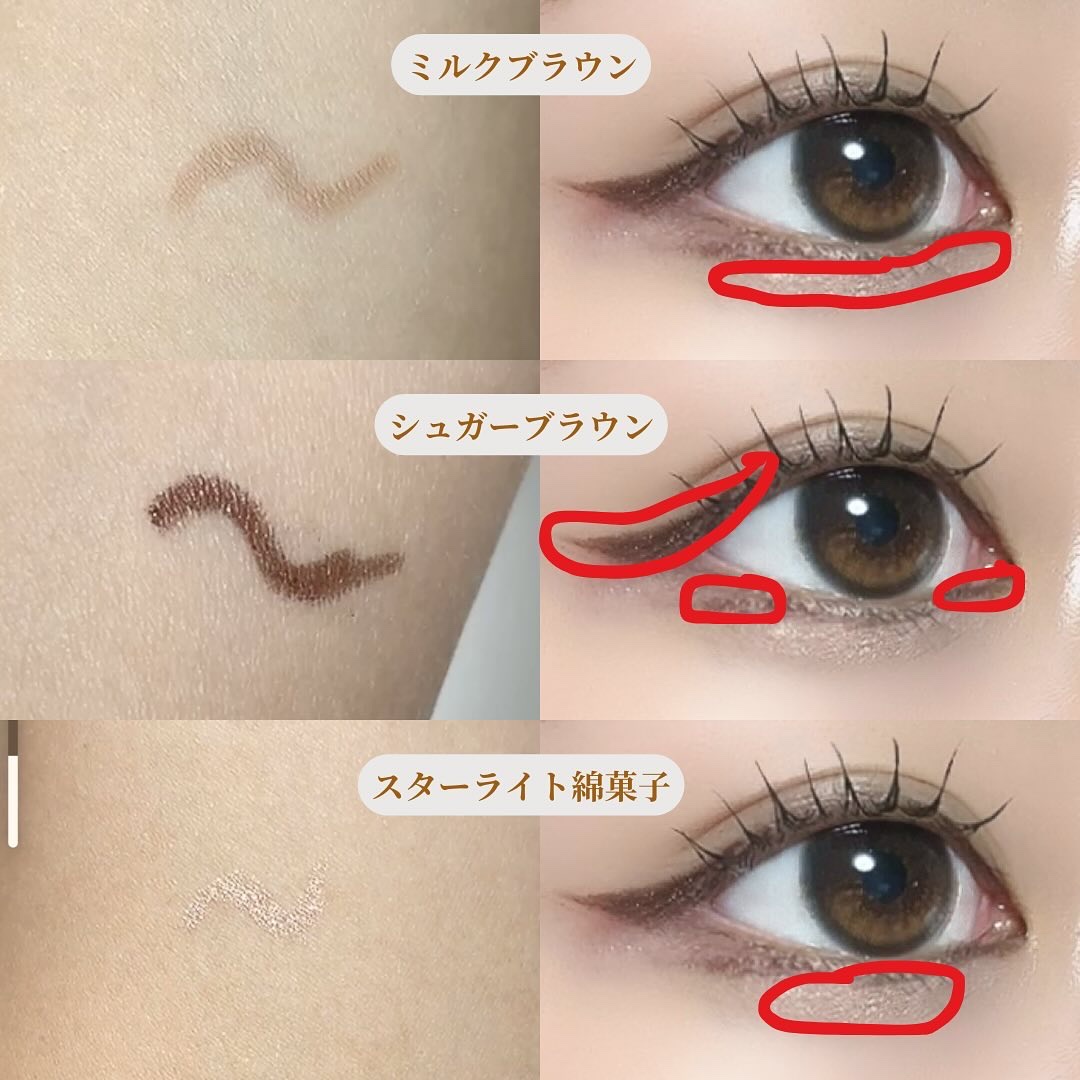 落ちにくく、滲みにくいです✏️密着も良く、するする描きやすかったです💗 ミルクブラウンは陰影にも⭕️ムーンライトオーロラ、スターライト綿菓子は涙袋にも可愛いです🥰 気になる方は是非チェックしてみてね🐰