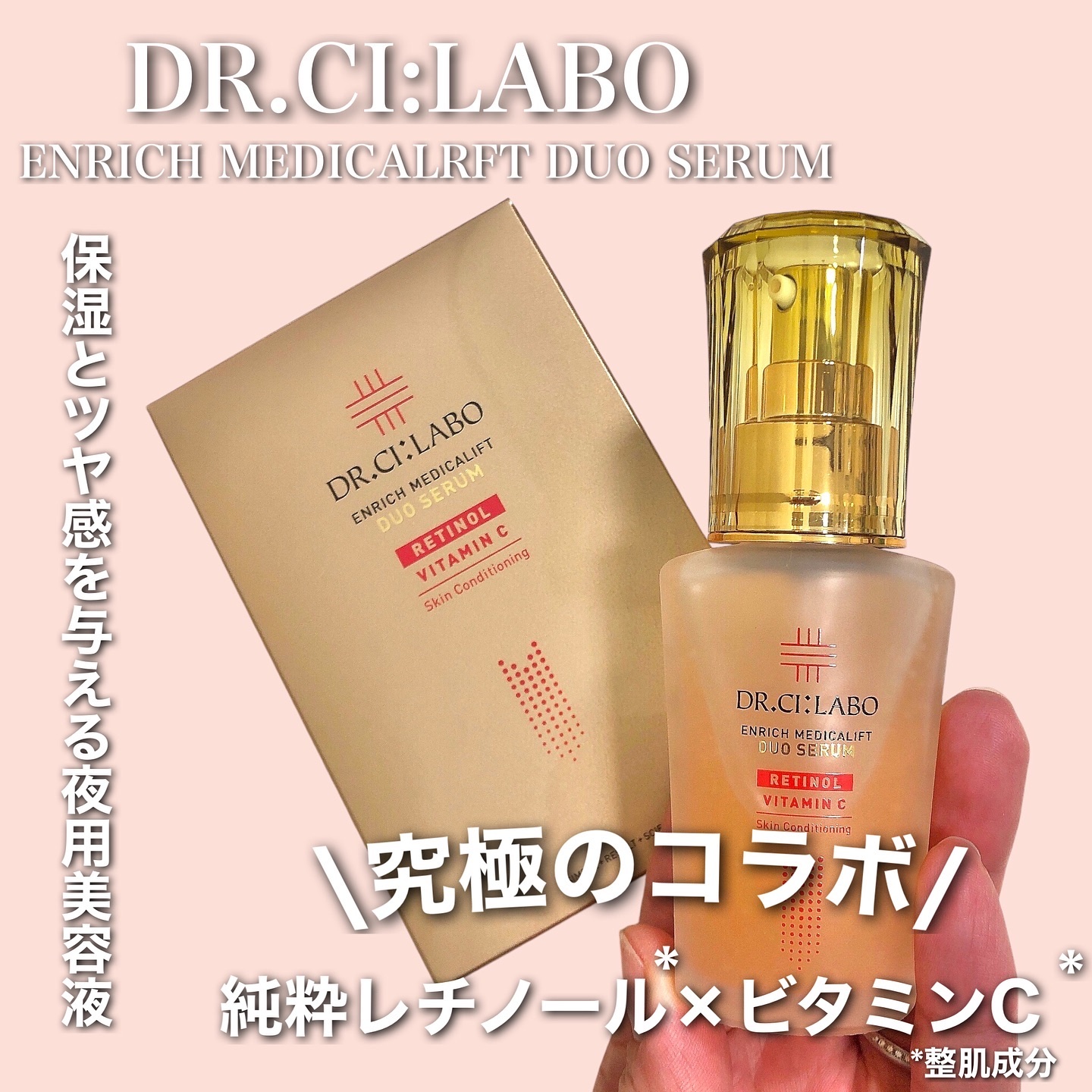 レチノール(整肌成分)×ビタミンCという人気美容成分を配合。 同時配合が難しい2大成分をドクターシーラボ独自処方の二層式によって実現✨ 使う直前に混ざることでそれぞれの成分をフレッシュな状態で使用できるんだとか👀