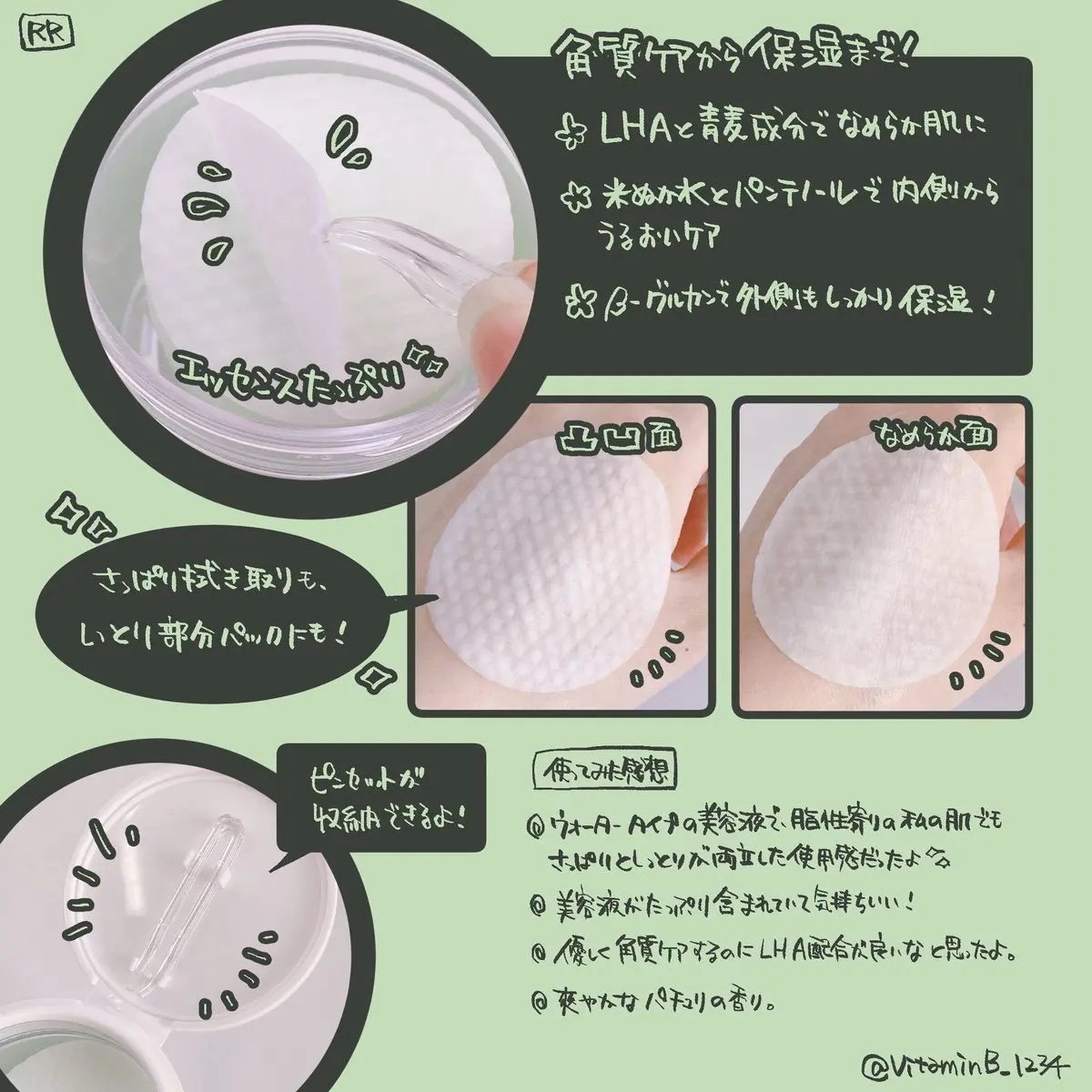 - 1. 3分のお手入れでクールな使い心地!化粧ノリの良い肌に整えるパッド 2. 保湿成分の青麦が水分を補い、しっとりサラサラにケア 3. トナーパッドの片面のエンボス面は、角質や皮脂を取り除く際に使用し、反対面はパックのように使用することで、乾燥悩みに合わせた集中ケア可能 4. メイクまで取れるぐらい古い角質の除去に特化されたLHA*トナーパッド。肌に優しい使い心地です。 *整肌成分