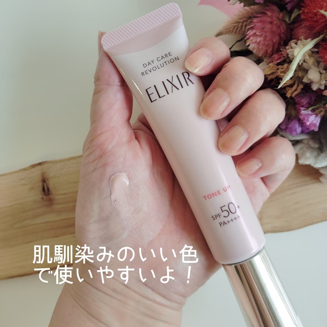 大バズりしていて売り切れ続出だった エリクシールのデーケアレボリューション♩ 乳液、UVカット、化粧下地の役割があって化粧水塗ったあとはこれ1本で済ませられるから時短にもなって嬉しい◎ 塗ってみるとちゃんと馴染んで自然な血色感を出しつつ、パーンっと明るい肌になってくれる🫶✨