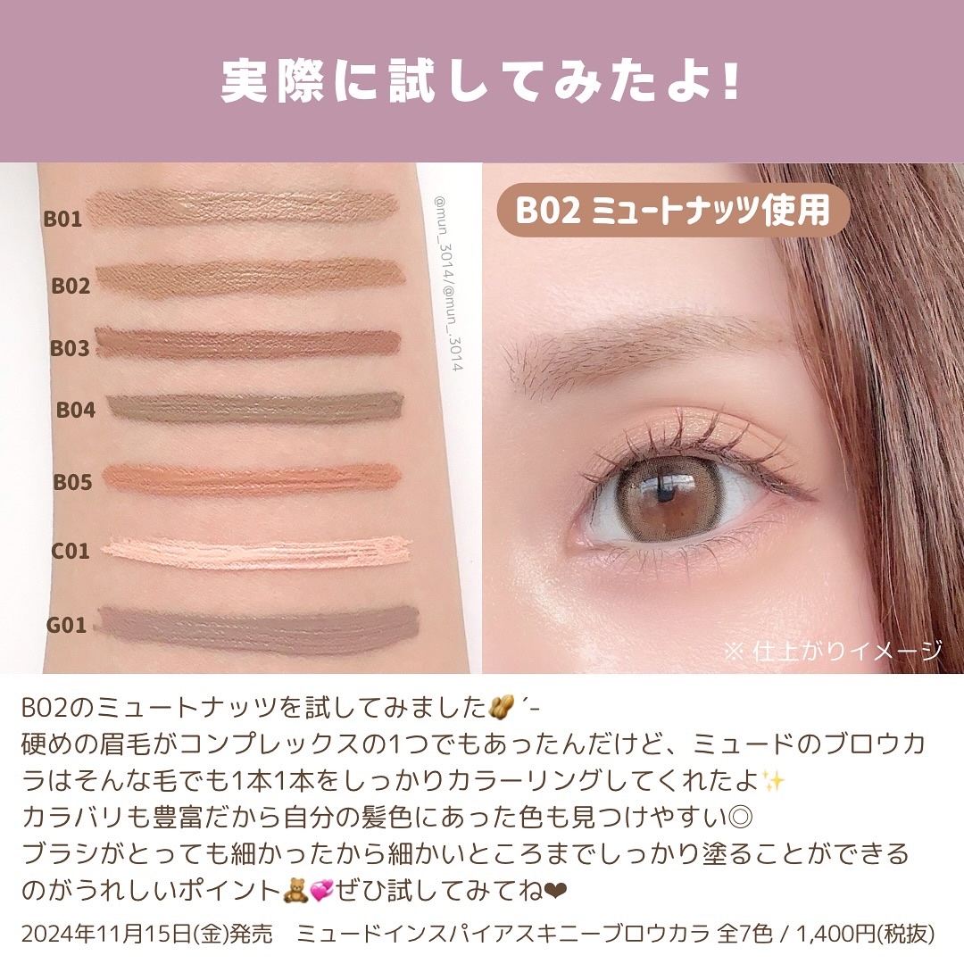 mudeインスパイアスキニーブロウカラB01ミルクティー一番明るいカラー、脱色した髪にC01フェードインブロウコンシーラー、カラーチェンジ前のベース用P01バニー雰囲気のある落ち着いたアッシュカラーモビッシュピンクミュート、アッシュ系のカラー...