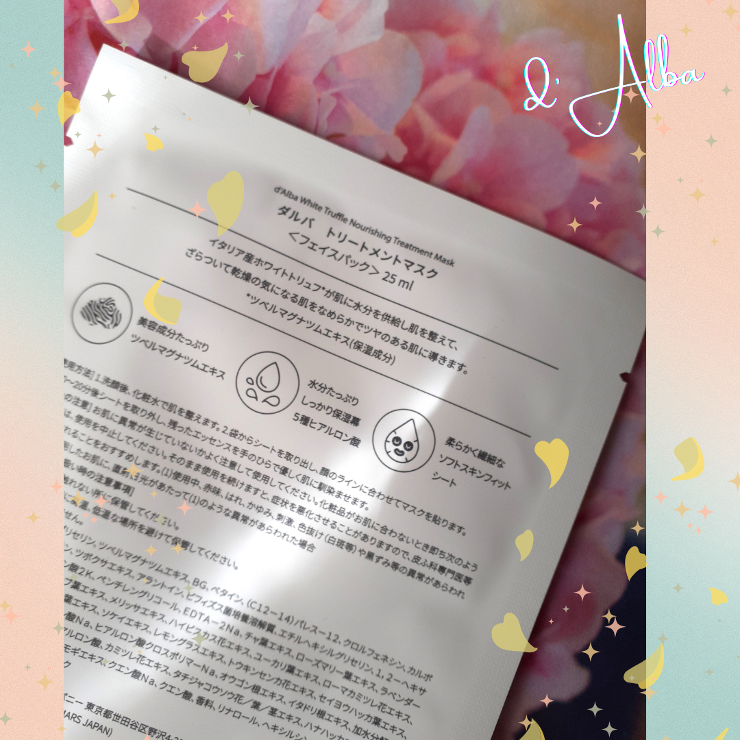今大人気のダルバ ホワイトトリュフファーストスプレーセラム ダルバホワイトトリュフファーストスプレーセラムはブースターとしてだけではなく、メイクの上からも使うことができるので乾燥対策にはぜひ持ち歩きたいですね。 ダルバ ホワイトトリュフナリシングトリートメントマスクは栄養・保湿たっぷり高濃縮セラム 密度の高い栄養保湿セラムフォーミュラが肌にしっかりと吸収され、ベタつかずにしっとりとした仕上がり