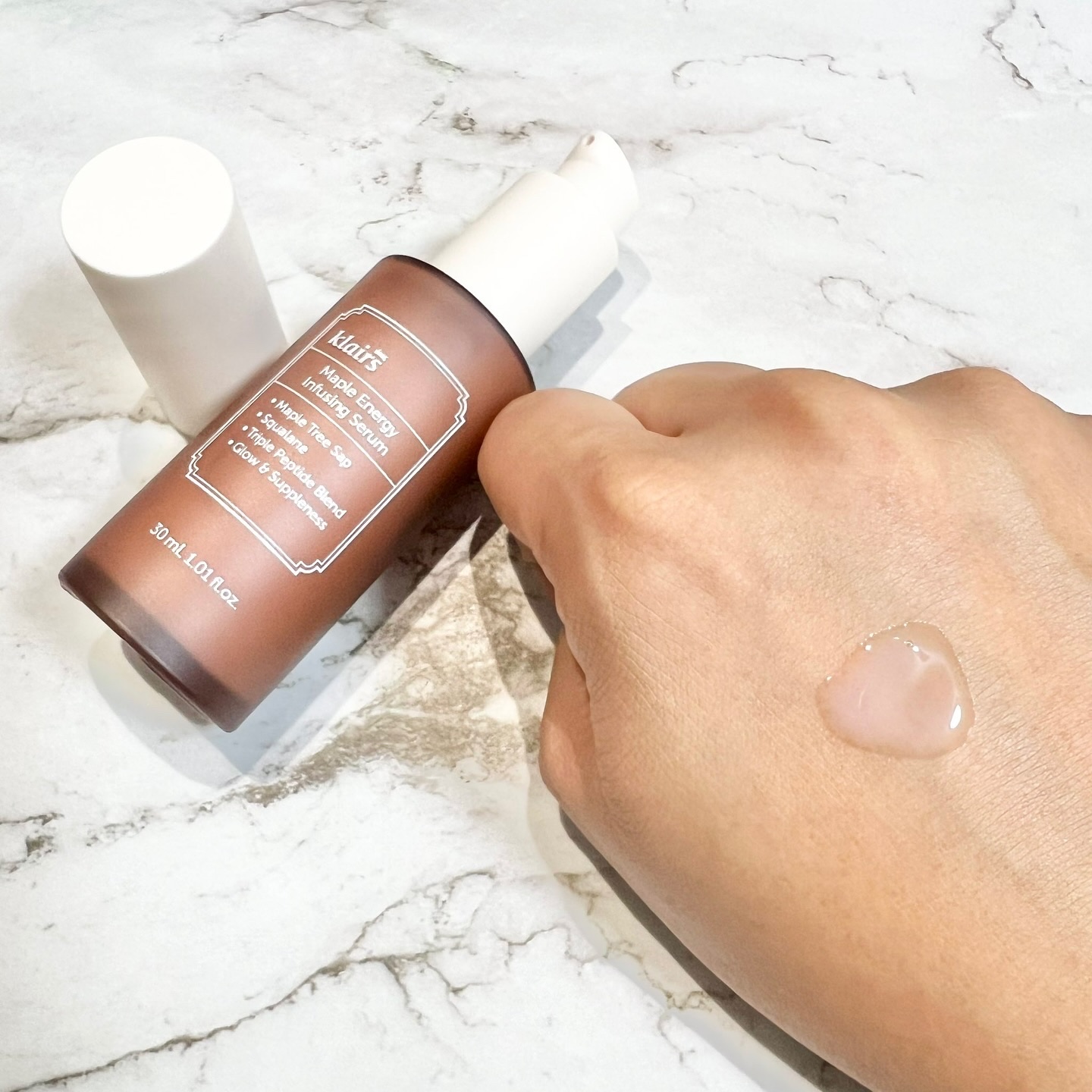 メープル液を濃縮して作った栄養豊富なセラム ×スクワラン×ペプチド 毛穴・弾力ケアに効果的 おでこ、目元、ほうれい線などの小ジワ改善の人体適用試験完了👍🏻 とろーんとのびるシロップテクスチャー ハリ艶がでてもっちり肌になるよ🧡🧡🧡