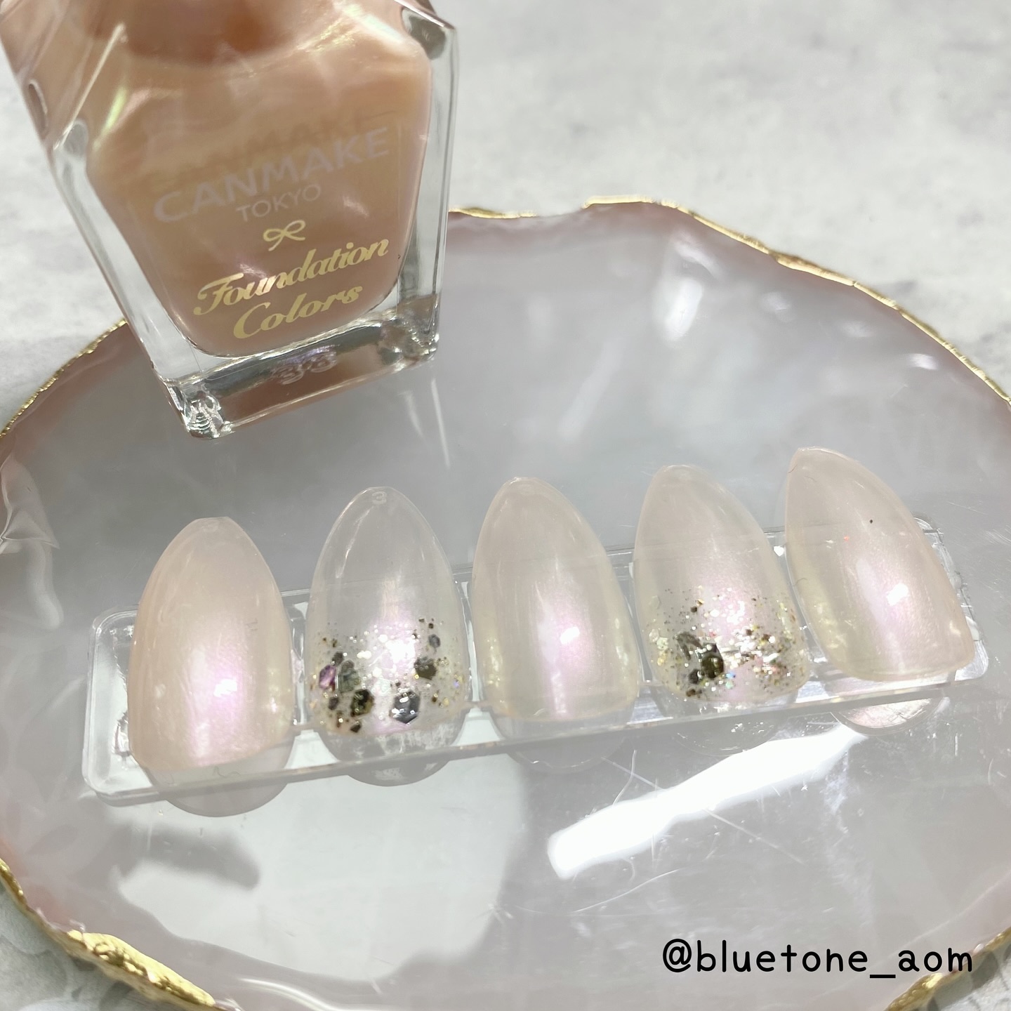 ラメがしっかりしてるし クリアカラーが入ってるから オーロラパウダー無しでも 充分キラキラしました! 反射強めのフィルムなので 実物はもっと うるうるとキラキラが強いです! ビー玉みたい🥺 ネイルシール長持ちさせたいけど ちょっと飽きてきたな〜って時とかに 全然違った印象になるのでオススメです! Seriaのベースジェル 本当にうるうるネイルしやすいので オススメしたい🙆♀️