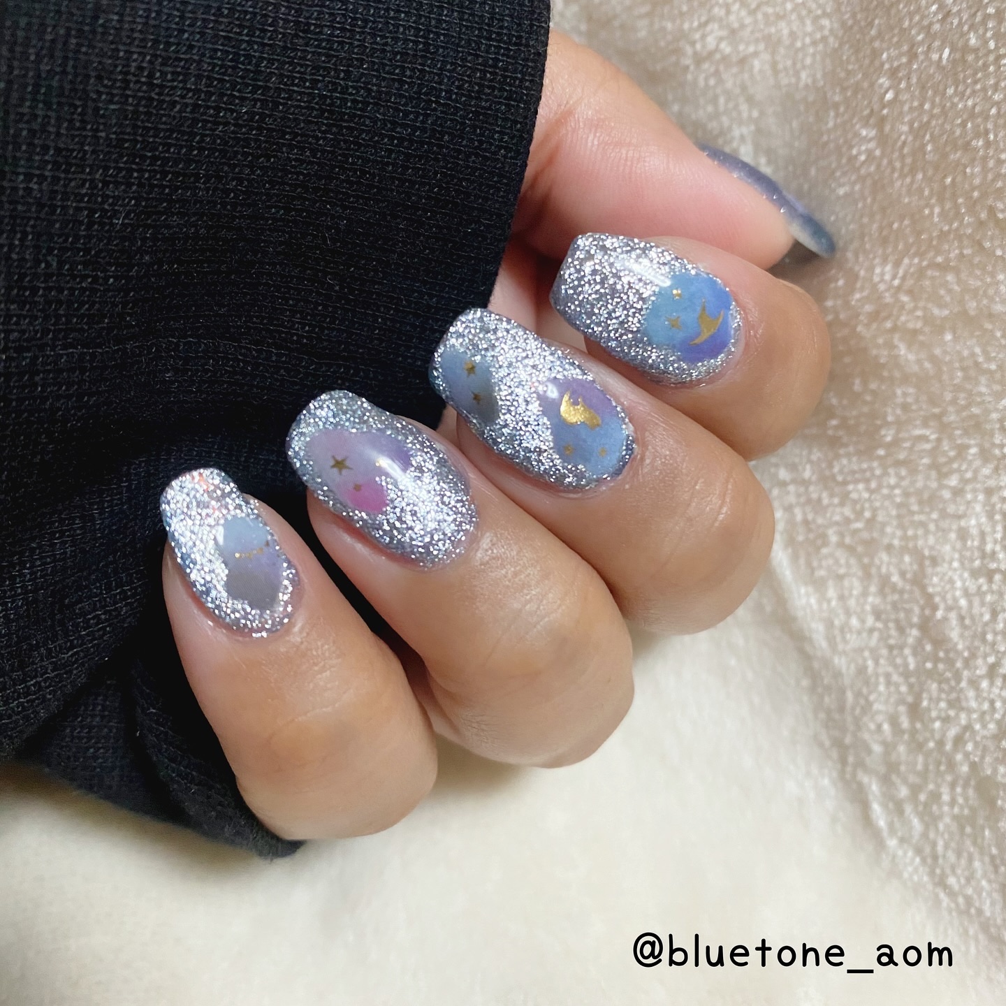 ラメがしっかりしてるし クリアカラーが入ってるから オーロラパウダー無しでも 充分キラキラしました! 反射強めのフィルムなので 実物はもっと うるうるとキラキラが強いです! ビー玉みたい🥺 ネイルシール長持ちさせたいけど ちょっと飽きてきたな〜って時とかに 全然違った印象になるのでオススメです! Seriaのベースジェル 本当にうるうるネイルしやすいので オススメしたい🙆♀️