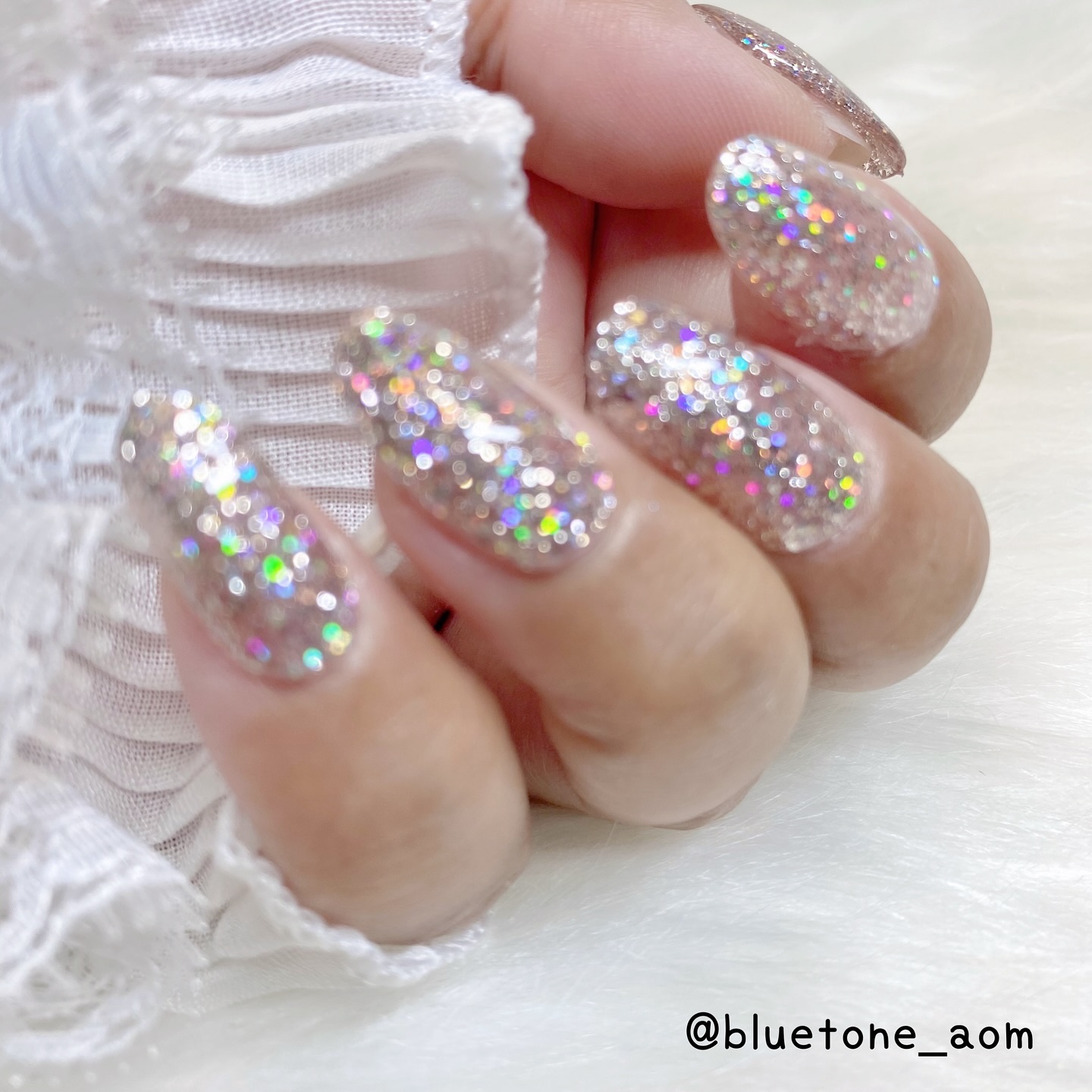 ラメがしっかりしてるし クリアカラーが入ってるから オーロラパウダー無しでも 充分キラキラしました! 反射強めのフィルムなので 実物はもっと うるうるとキラキラが強いです! ビー玉みたい🥺 ネイルシール長持ちさせたいけど ちょっと飽きてきたな〜って時とかに 全然違った印象になるのでオススメです! Seriaのベースジェル 本当にうるうるネイルしやすいので オススメしたい🙆♀️