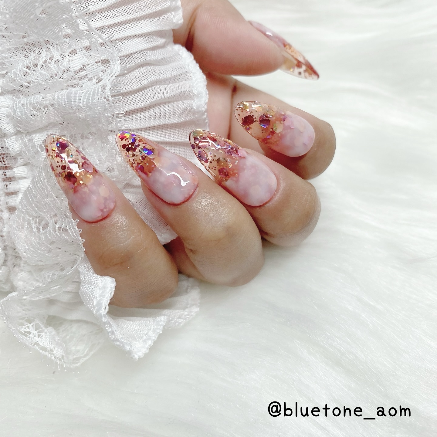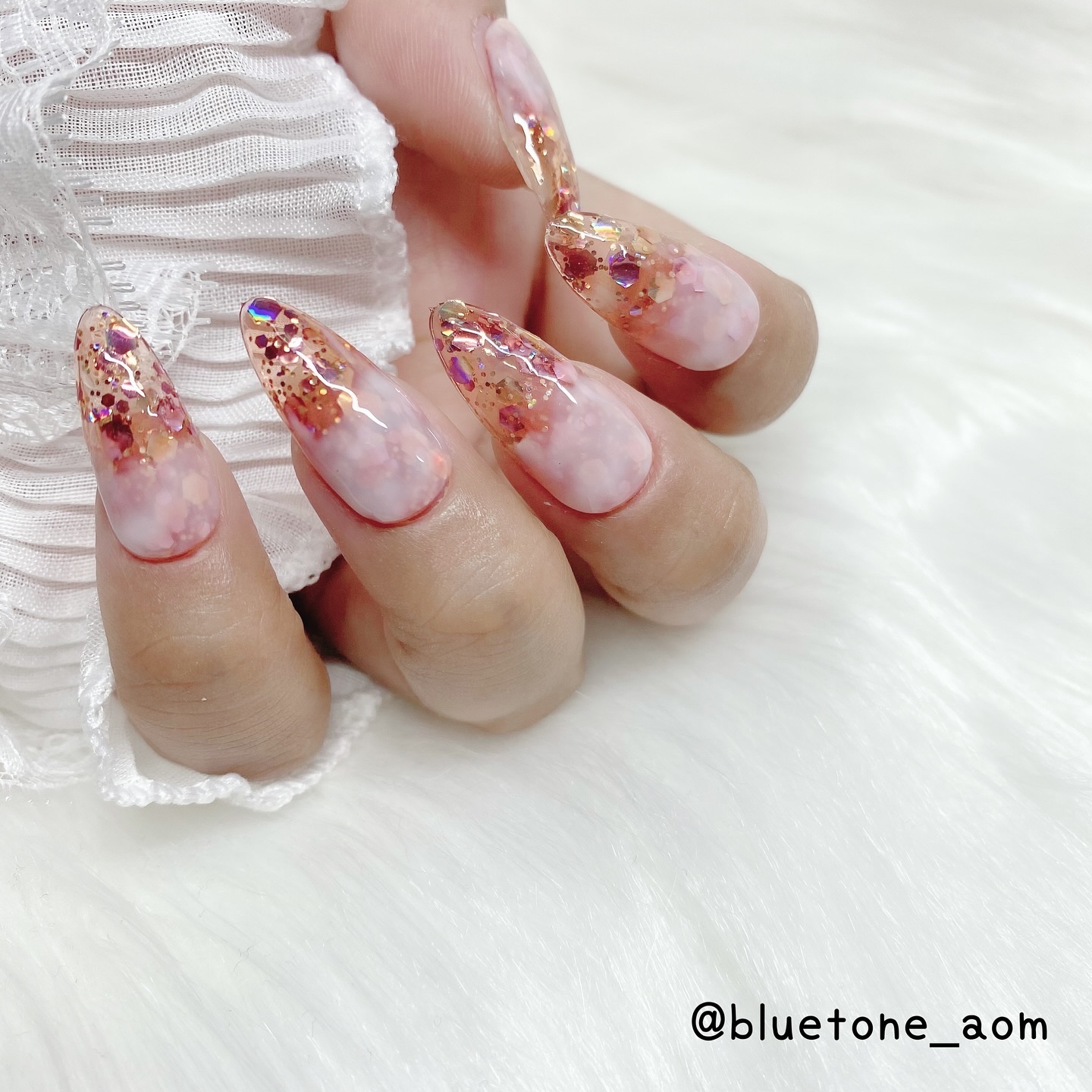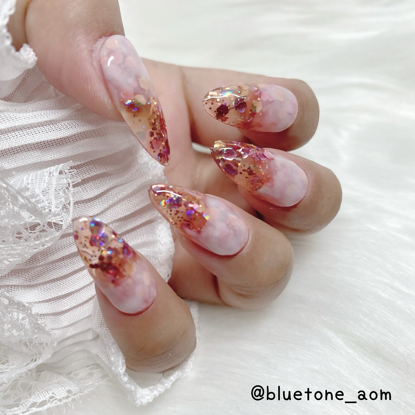 ラメがしっかりしてるし クリアカラーが入ってるから オーロラパウダー無しでも 充分キラキラしました! 反射強めのフィルムなので 実物はもっと うるうるとキラキラが強いです! ビー玉みたい🥺 ネイルシール長持ちさせたいけど ちょっと飽きてきたな〜って時とかに 全然違った印象になるのでオススメです! Seriaのベースジェル 本当にうるうるネイルしやすいので オススメしたい🙆♀️