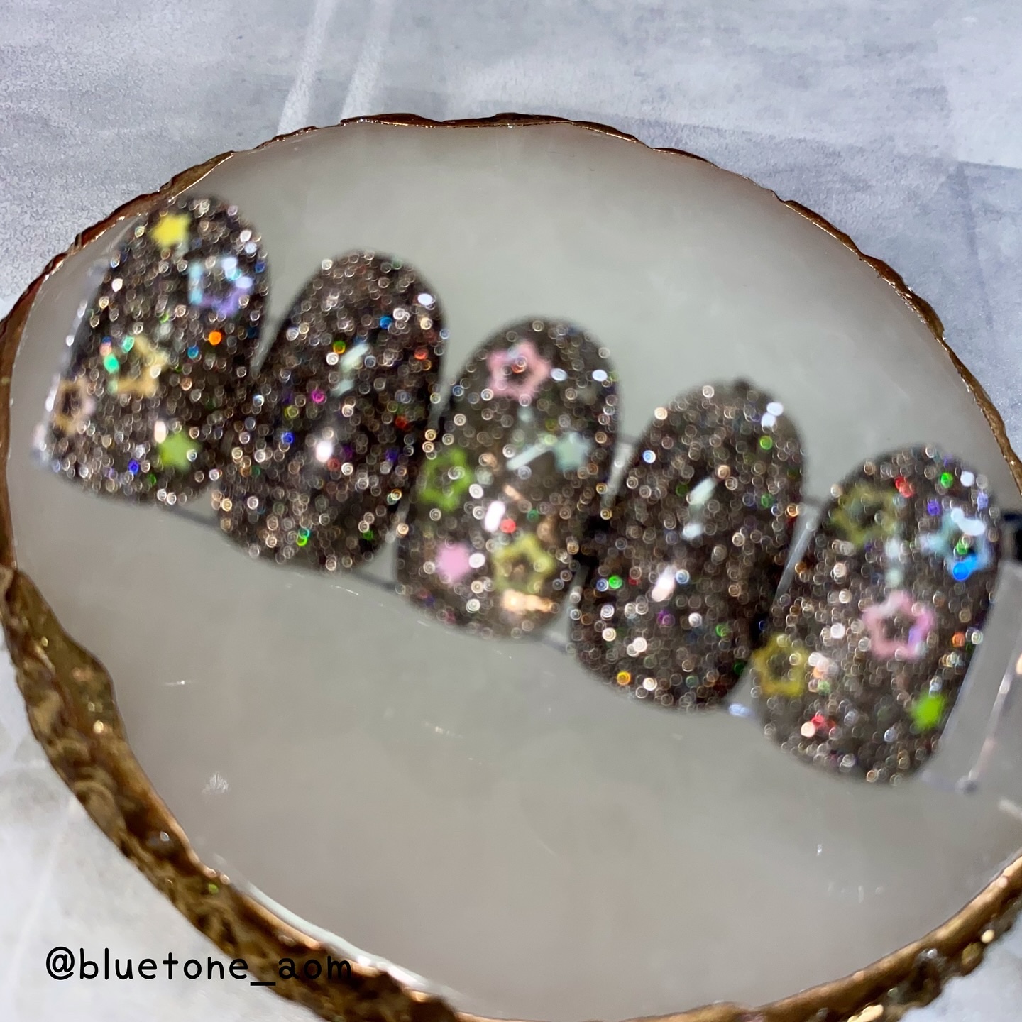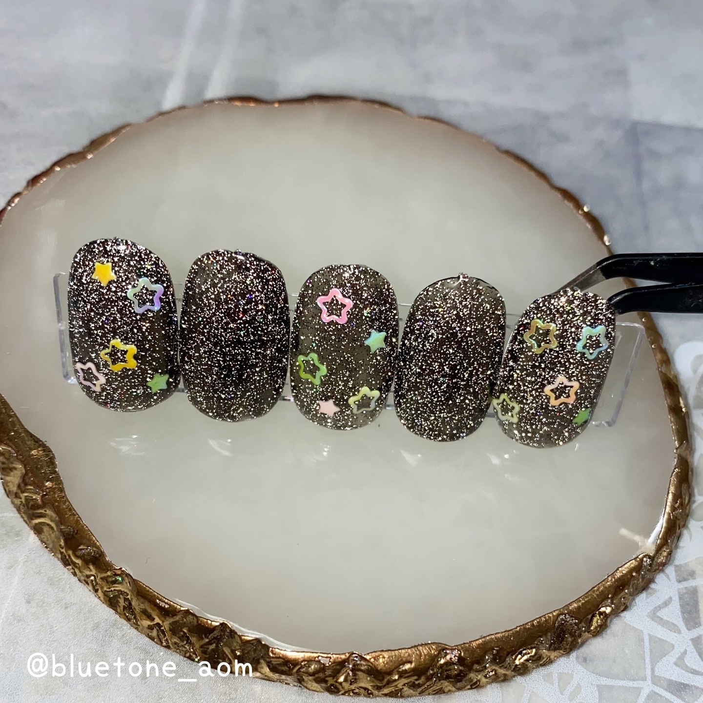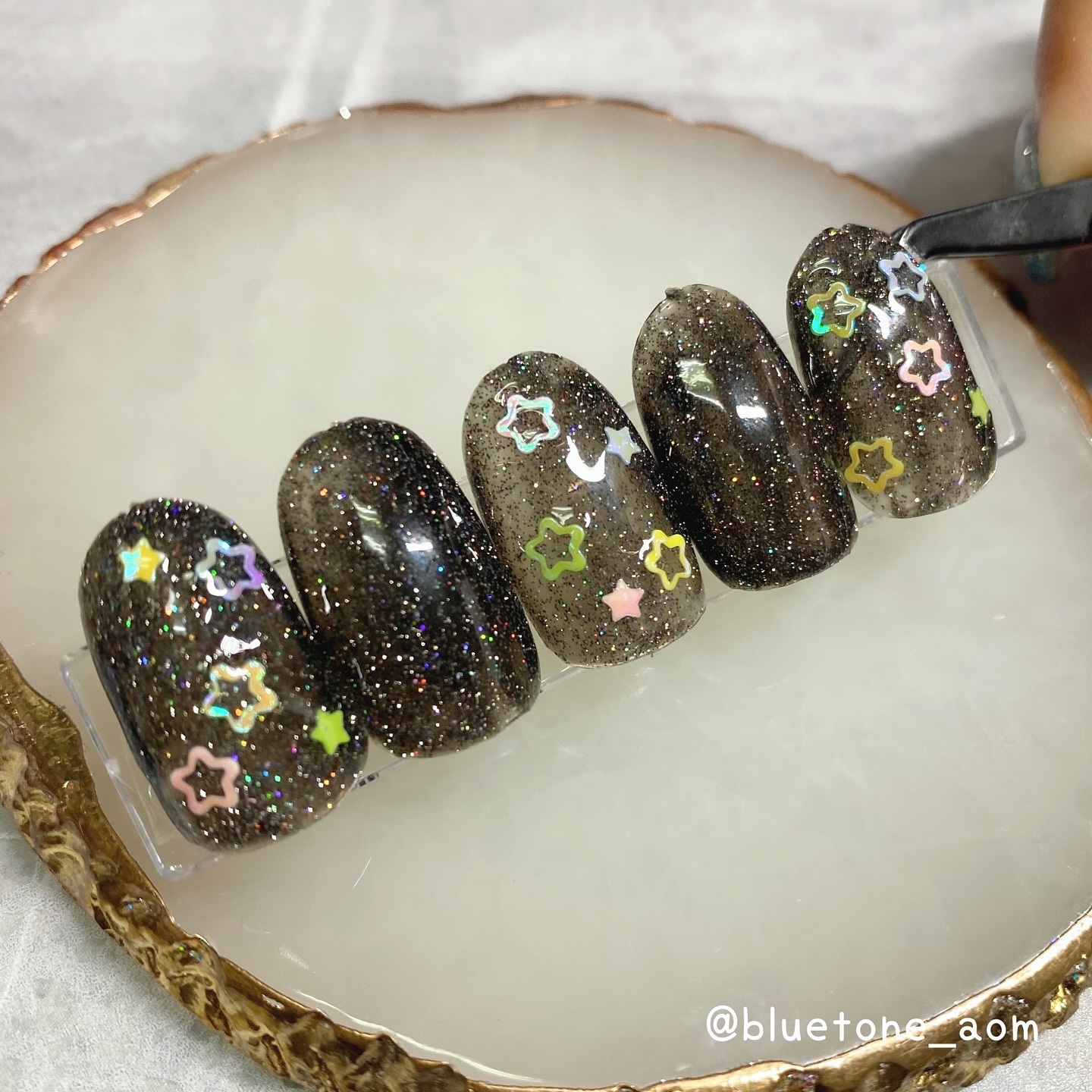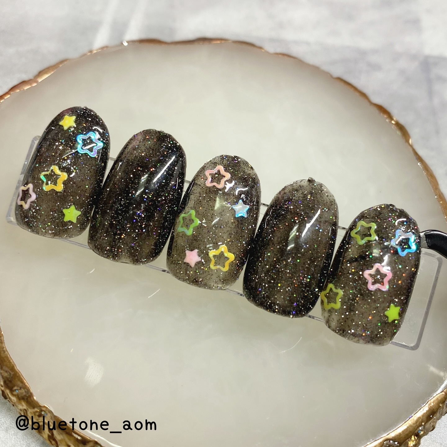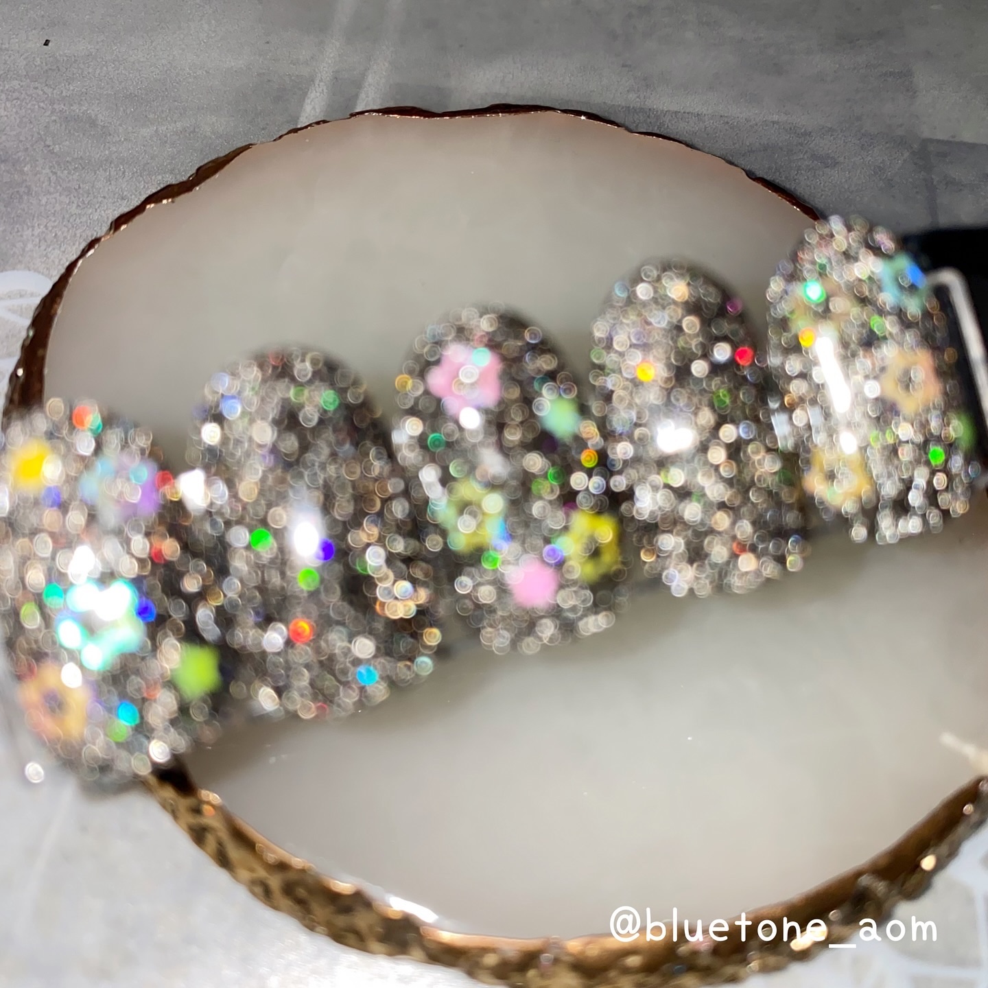ラメがしっかりしてるし クリアカラーが入ってるから オーロラパウダー無しでも 充分キラキラしました! 反射強めのフィルムなので 実物はもっと うるうるとキラキラが強いです! ビー玉みたい🥺 ネイルシール長持ちさせたいけど ちょっと飽きてきたな〜って時とかに 全然違った印象になるのでオススメです! Seriaのベースジェル 本当にうるうるネイルしやすいので オススメしたい🙆♀️