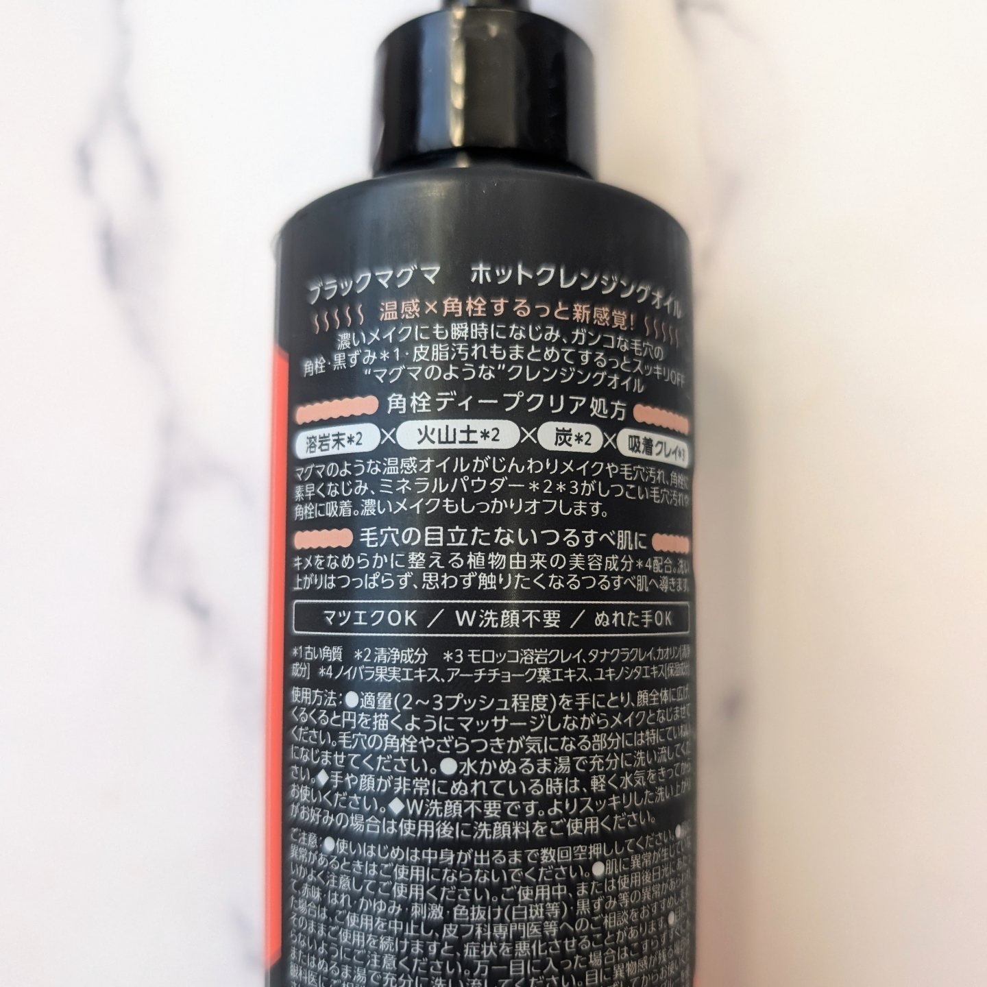 - ・温感オイル×ミネラルパウダー*5× 美容成分*4でメイクを落としながらしっかり毛穴ケア! *4 ノイバラ果実エキス、アーチチョーク葉エキス、ユキノシタエキス、ショウガ根エキス[保湿成分] *5 溶岩末、火山土、炭、モロッコ溶岩クレイ、タナクラクレイ、カオリン[清浄成分] 肌にのばすと瞬時に“温感”を感じるオイルタイプのクレンジング。オレンジ色のオイルは煮えたぎるように熱いマグマを表現しています。 ■するっと!角栓ディープクリア処方 マグマのような温感オイルがじんわり肌をほぐしながら、メイクに素早くなじみ、毛穴汚れや角栓を溶かします。さらに、ミネラルパウダー*5がしつこい毛穴の黒ずみ*3、皮脂汚れを吸着してかき出します。 *3 古い角質 *5 溶岩末、火山土、炭、モロッコ溶岩クレイ、タナクラクレイ、カオリン[清浄成分] ■毛穴汚れ・ざらつきにアプローチするミネラルパウダー*5配合! マグマに由来する溶岩末*1、火山土*1のほか、炭*1、吸着クレイ*2といったミネラルパウダーを配合。気になる毛穴の汚れやざらつき・角栓にアプローチしてしっかり除去します。 *1 清浄成分 *2 モロッコ溶岩クレイ、タナクラクレイ、カオリン[清浄成分] *5 溶岩末、火山土、炭、モロッコ溶岩クレイ、タナクラクレイ、カオリン[清浄成分] ■毛穴の目立たないつるすべ肌*6へ導く美容成分*4配合! 植物由来の美容成分*4配合で、肌のキメを整え、毛穴の目立たないつるすべ肌*6へ。 *4 ノイバラ果実エキス、アーチチョーク葉エキス、ユキノシタエキス、ショウガ根エキス[保湿成分] *6 うるおいによる肌印象 ■W洗顔不要 ■マツエクO K ■ぬれた手O K ■マグマをイメージしたデザイン パッケージ・ビジュアルは、力強さを表現するブラックをベースに、熱いマグマがどろっと流れるイメージをデザインしています。