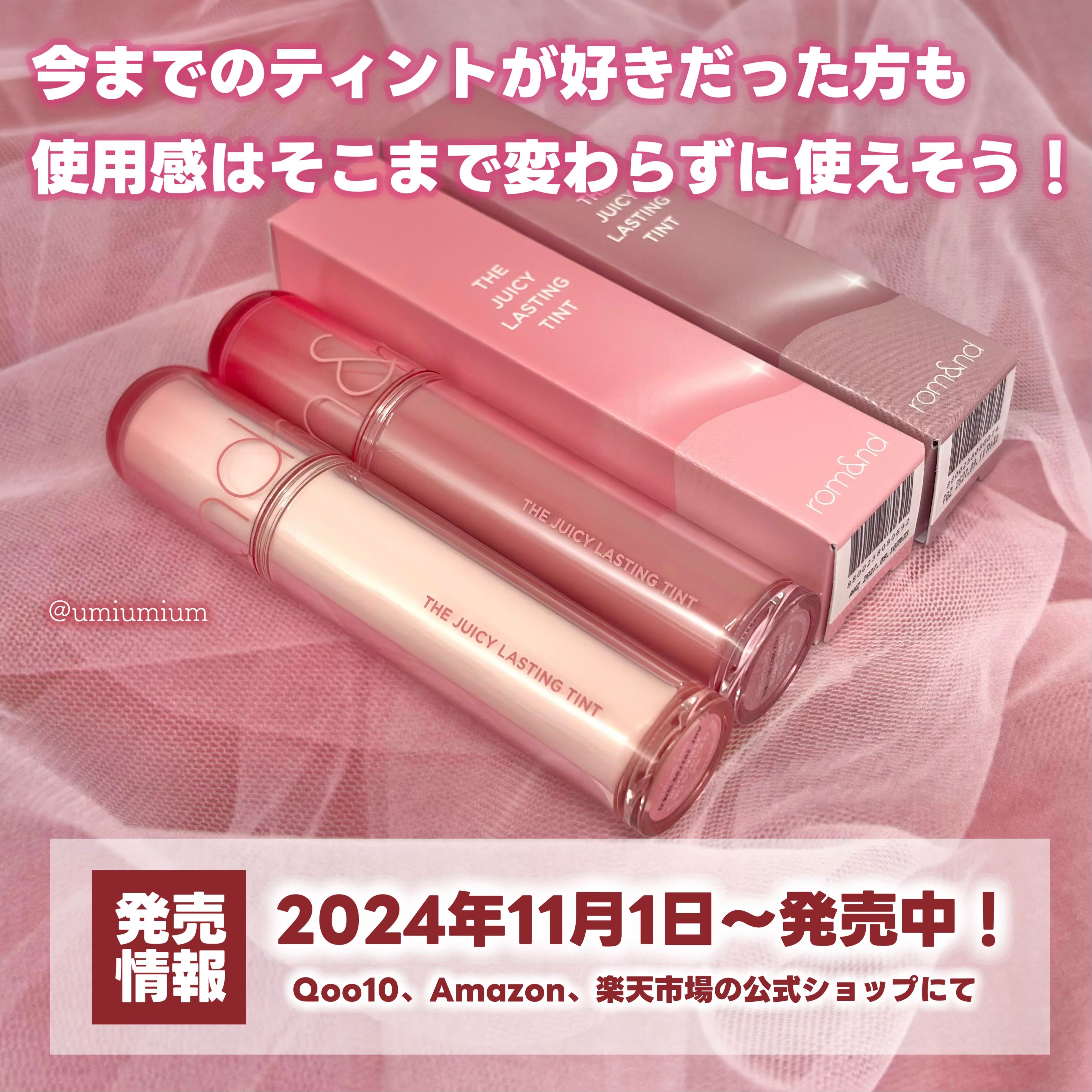 ロムアンドさまからいただきましたロムアンドザジューシーラスティングティントロムアンドの人気アイテムジューシーラスティングティントが新色を加えてパワーアップしてリニューアル!今回は日本限定色の18JUJUBEJAMと、発売直後メイン人気カラーラ...
