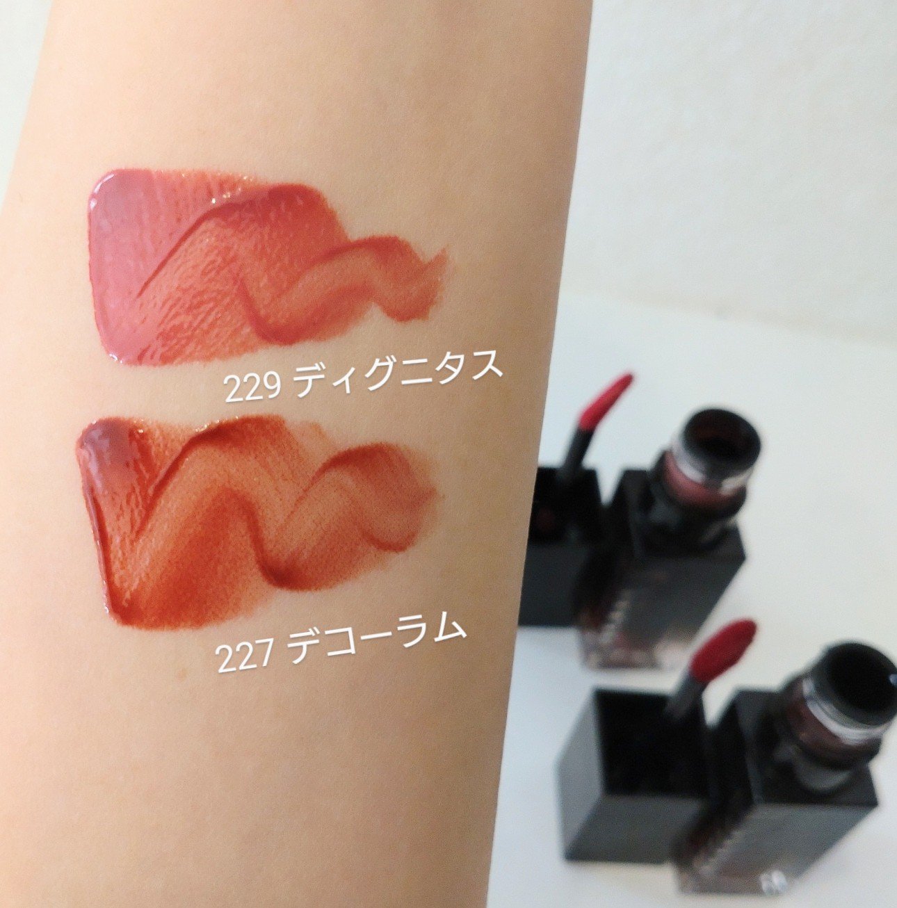しっとりとした光沢感とべたつかないつけ心地、塗った直後にティッシュオフしても残る色味、絶妙なカラー展開が魅力のDintoティント♡ 221 Temet Nosce アッシュなモーヴピンク。青みと白みのバランスがかっわいいお気に入りカラー 229 Dignitas ダスティーローズ。そんなに深みはなくてちゃんと血色感の出るカラー。