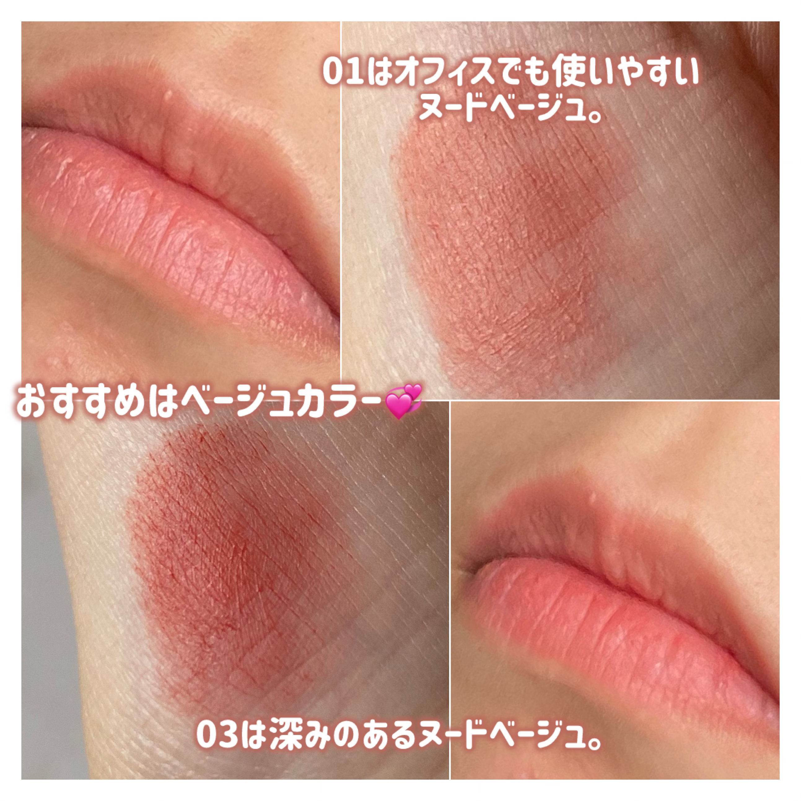 ふわふわ柔らかいマットタイプが登場していた〜!なめらかで雲のようにふわふわなテクスチャー☁️ カラーは明るくソフトな色展開で全部好きでした😮💞 ピンクみがかったグレーでふわっと唇の色味をカバーしてくれるのでリップベースとして使ったり、唇の影を作ったりするのにも使えるよ👏🏻