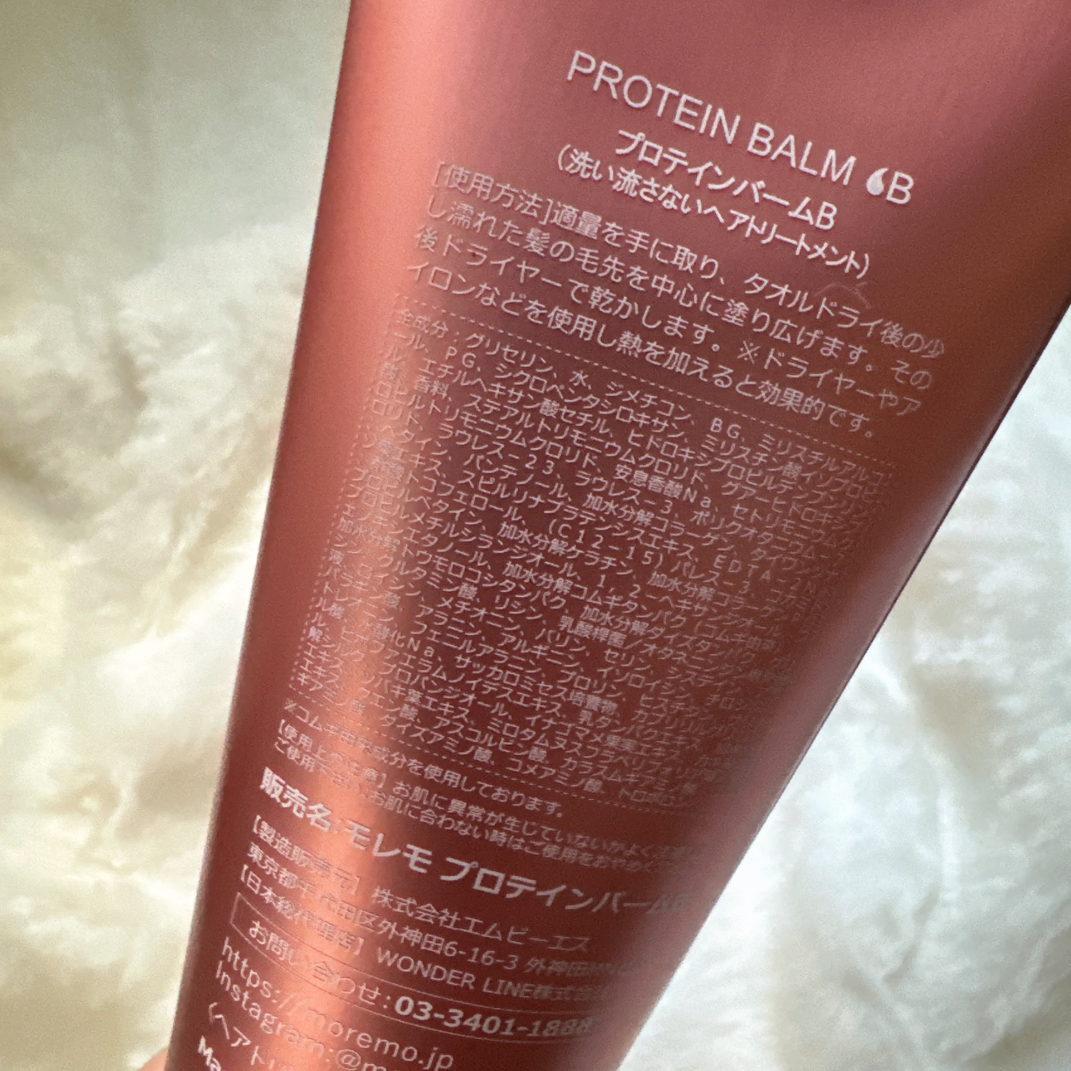 - 【洗い流さないトリートメント】 毛髪の構成成分を集中補修するトリートメント。21種類のアミノ酸と7種類のタンパク質を配合し、しなやかな髪へと導きます。 【ドライヤーの熱ダメージをケア】 ドライヤーやヘアアイロン、コテを使用する前にプロテインバームBを使用すると、タンパク質がコーティング膜を作って乾燥した熱から毛髪を保護します。日々蓄積される熱ダメージから24時間髪を守ります。 【ベタつかず軽い仕上がりと心地ののよい香り】 するっととろけるバームのテクスチャーで軽やかでサラサラな仕上がりをキープし、髪が重くならずナチュラルなに仕上がります。また、上品でリラックスできるフローラルムスクの香りで、使うたびに心地よいヘアケアタイムを演出します。