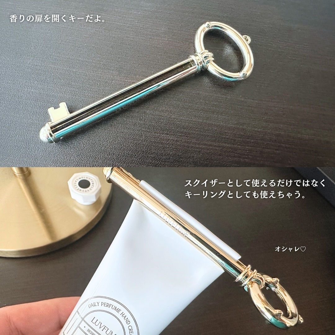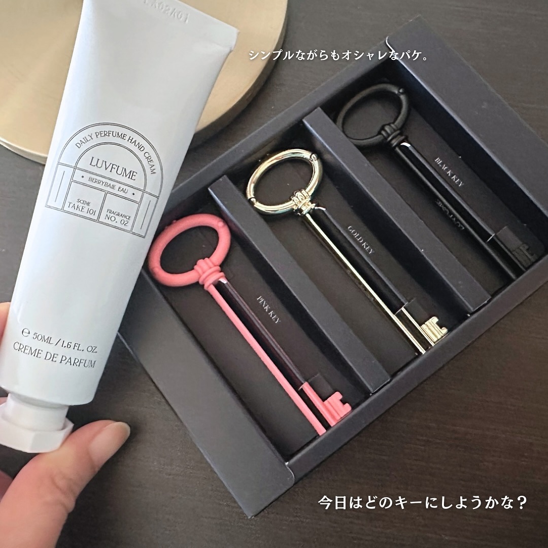 感覚的な香りでいい香り💐 セレブにも愛されているハンドクリーム🫱 LUVFUMEならではのシグネチャー製品であるキーデザイン🔑 いろんなアレンジでハンドクリームをキーリングで飾ることができるよ! ぶら下げてるとすぐ使えて便利やし可愛い♡ LOFTとQoo10で購入できるよ🐱