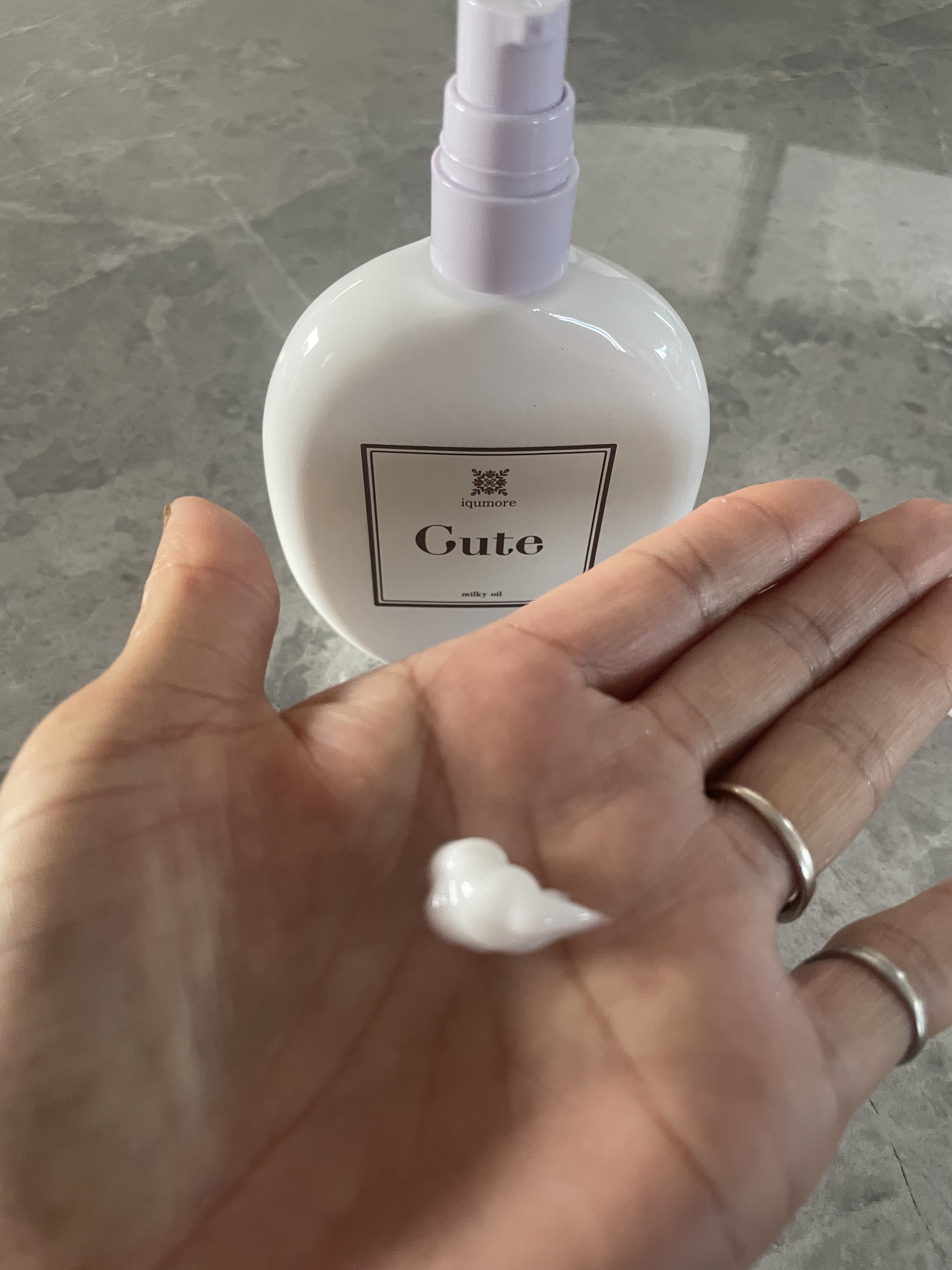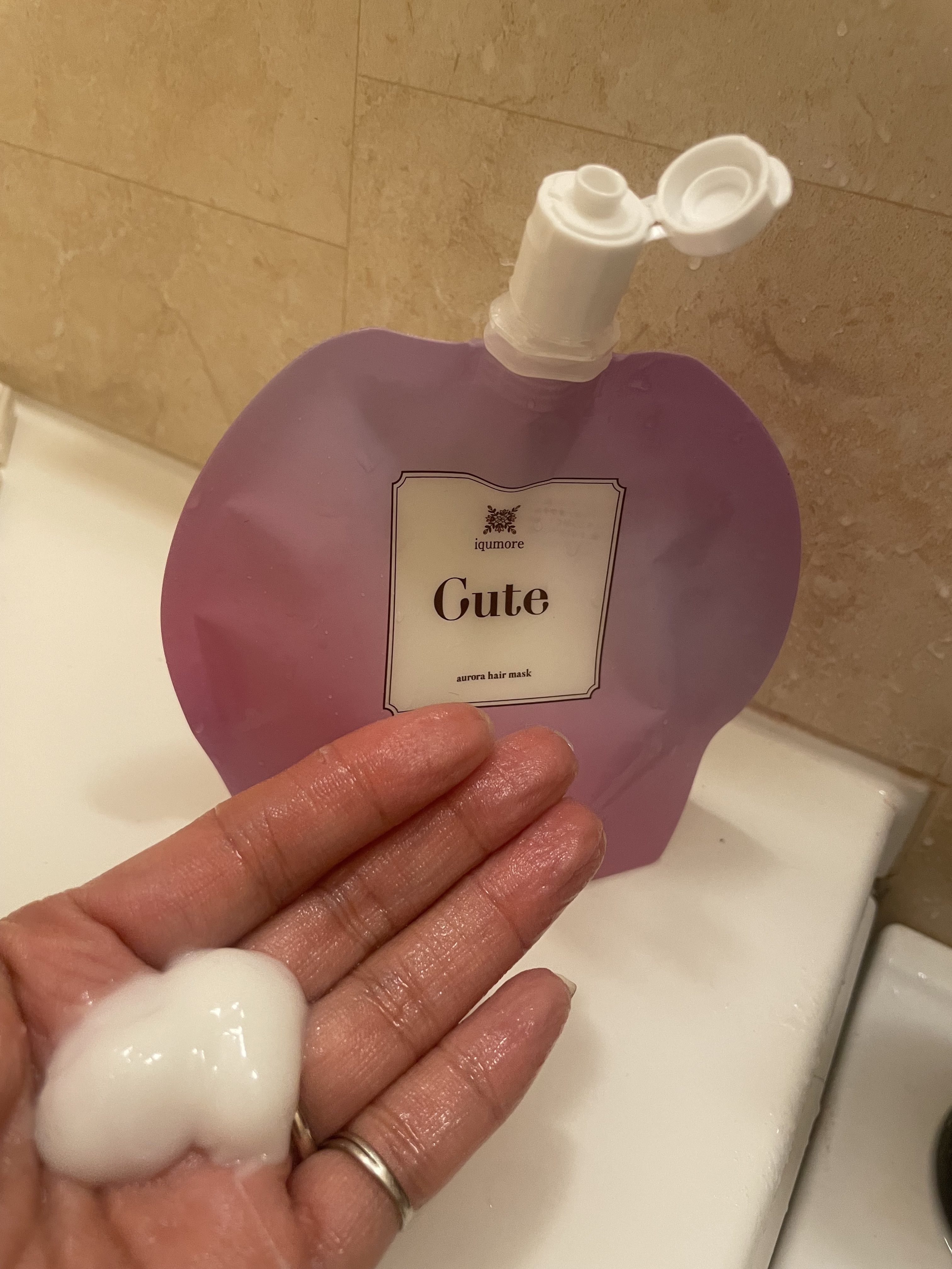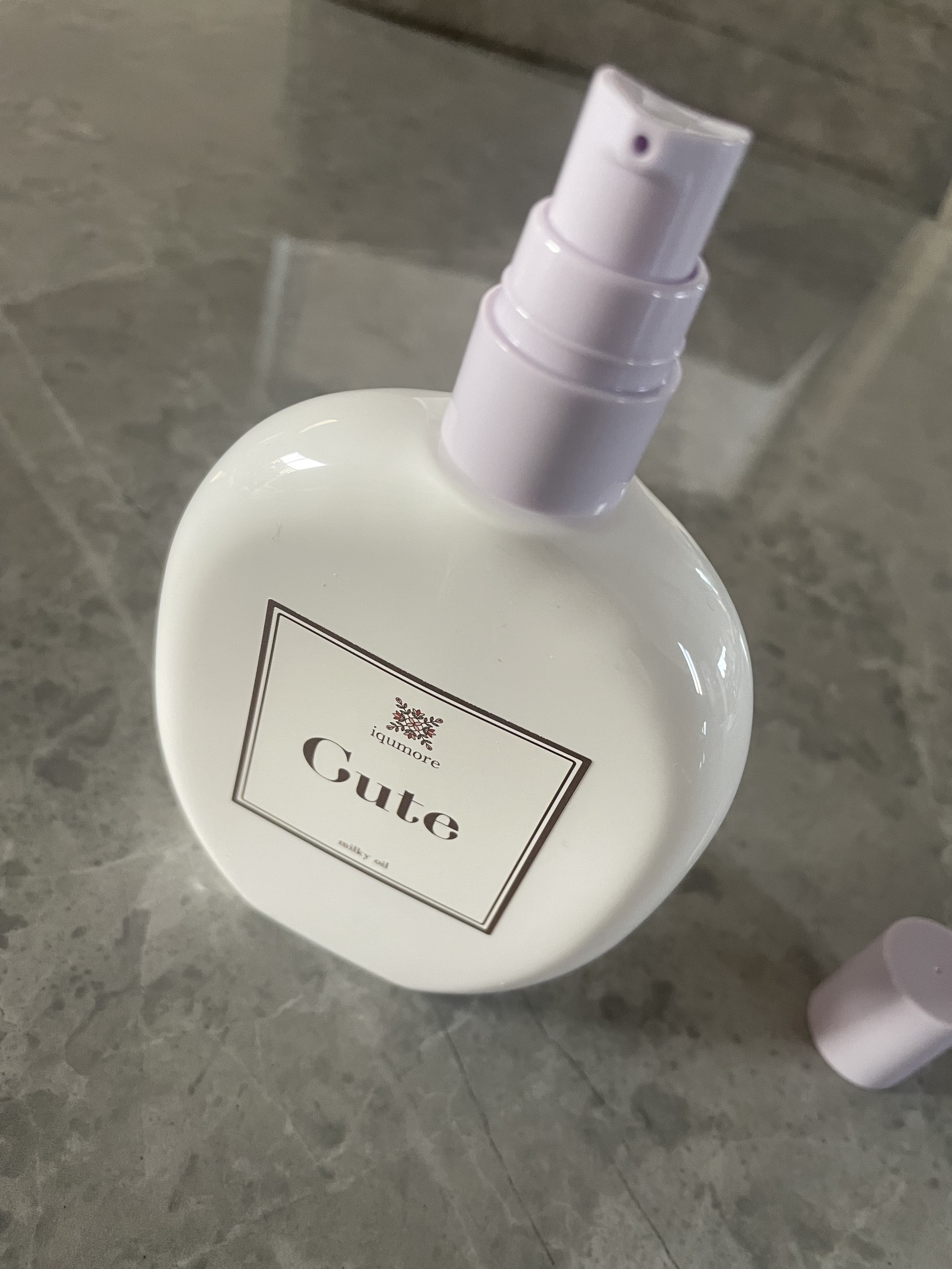 イクモアキュート ヘアケアエッセンスの96.5%は天然由来成分でできているそうです。ノズルを回して直接塗布できます。サラっとしてべたつきもないです。 髪の内部に潤いを与えながらダメージ髪を補修し、表面をコーティングすることで色落ちを抑えるヘアマスク。爽やかで華やかなアールグレイティーの香り。 べたつかないのにうるおいを感じる、柔らかくスーっとなじむテクスチャ。みずみずしい乳液のようなテクスチャーで伸びが良く、髪になじみやすいです。