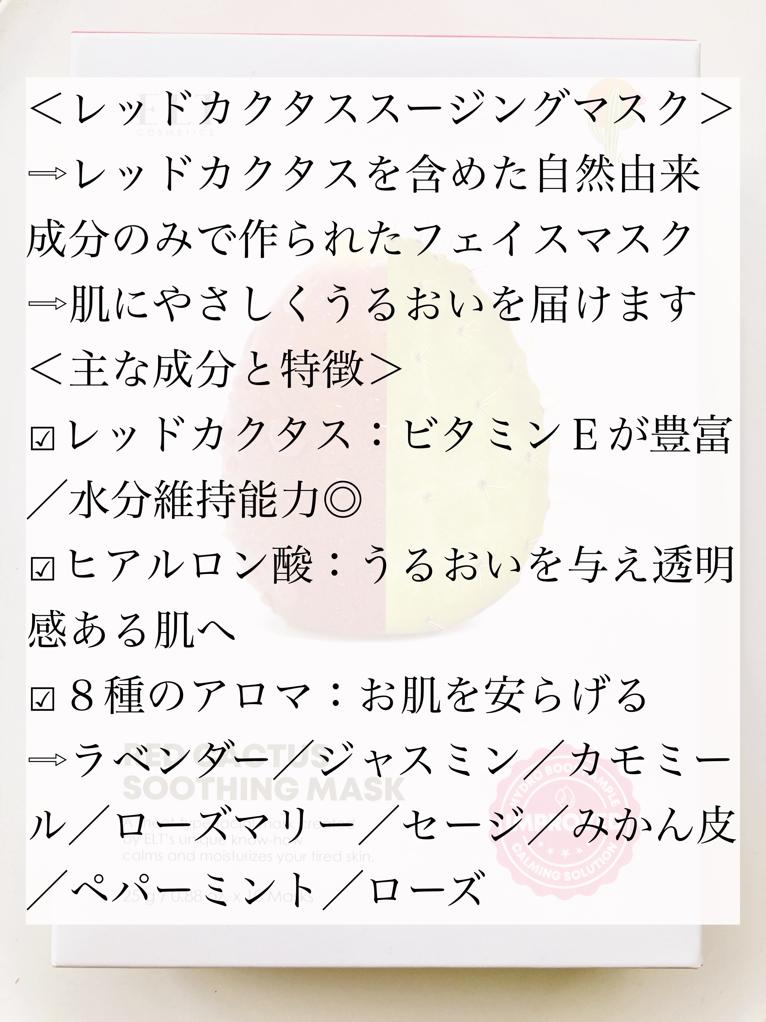 塗るマルチビタミンのパック ラベンダー・バラエキスを使用して荒れた肌をやさしく艶やかにケア❣️ レッドカクタスとは韓国のチェジュ島に生息するサボテンの実で抗酸化に優れたビタミンEが多く水分の維持能力に優れてるよ❤️❤️ 自然由来成分のみで作られたパックで8種のアロマとヒアルロン酸を配合し肌に優しくうるおいを届けてくれる🩵🩵