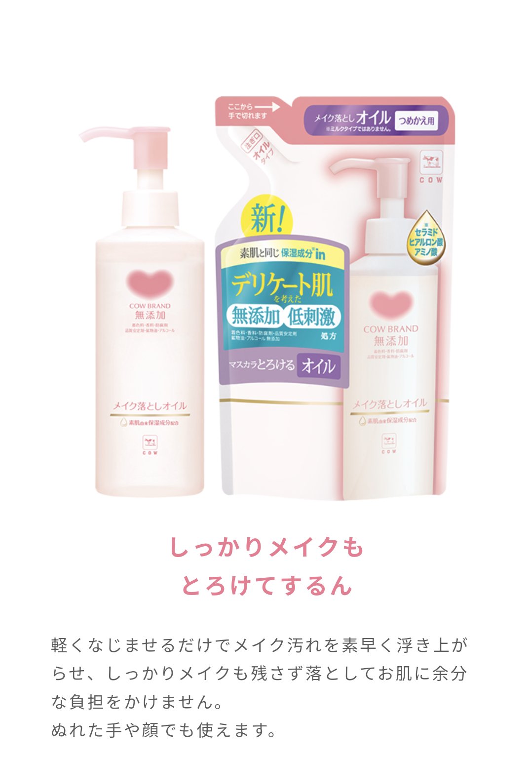 カウブランド無添加さまからいただきました無添加・低刺激処方でデリケートなお肌にも使えちゃう、カウブランド無添加さんのメイク落としオイルを使ってみました♡比較的さらりとしたテクスチャーのオイルはしゃばしゃばしすぎていない程よいクッション感で、し...
