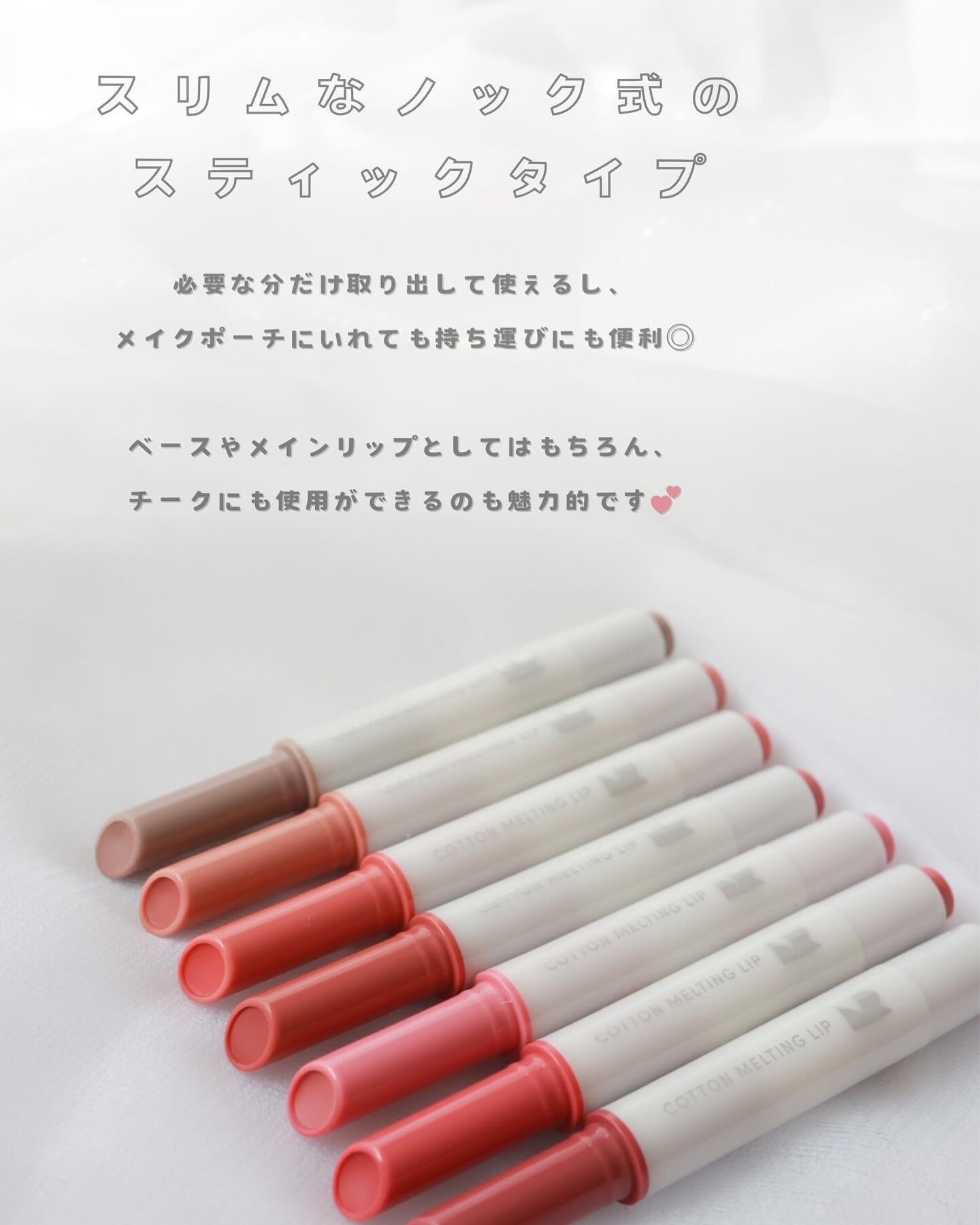 - ふんわりマシュマロ唇が作れちゃう「コットンメルティングリップ」が登場! シアバターと8種のヒアルロン酸配合で、マットリップなのに軽やかにうるおう新概念リップです。 イエベ・ブルべ問わず肌馴染みのいい7色展開で、いずれも落ち着いたミュートカラーが特徴。唇の質感をふんわりとぼかしながらマシュマロのような唇を演出します。 さらにチークやアイシャドウ、シェーディングにも使えるマルチユース。 1本ポーチに忍ばせればメイク直しも簡単です。