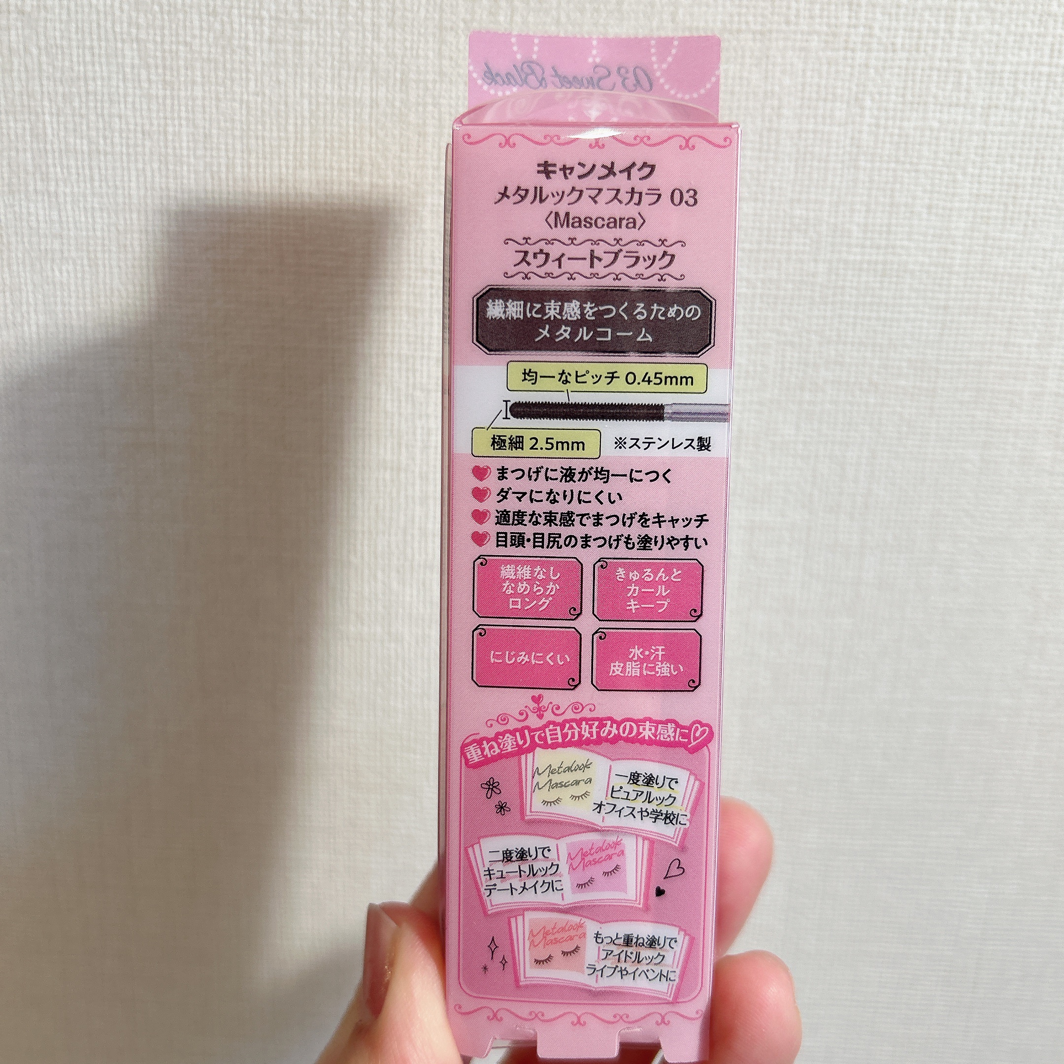 - 01 ブラックは2024年4月以降順次定番化! メタルコームが塗りやすい♡ 自分好みの束感がつくれるマスカラ 流行りの束感まつげ、今日はどのルックにする? ♡繊細な束感をつくるための極細メタルコーム 束感のあるまつげをつくるために設計された均一なピッチが、 程よく数本のまつげを束ねます。 届きにくい目頭や目尻のまつげも塗りやすい! ♡重ね塗りで自分好みの束感に なめらかな液がまつげに均一につくので、 重ね塗りをしてもダマになりにくい! 繊細でナチュラルな束感~盛り束感まで、これ1本で自由自在♪