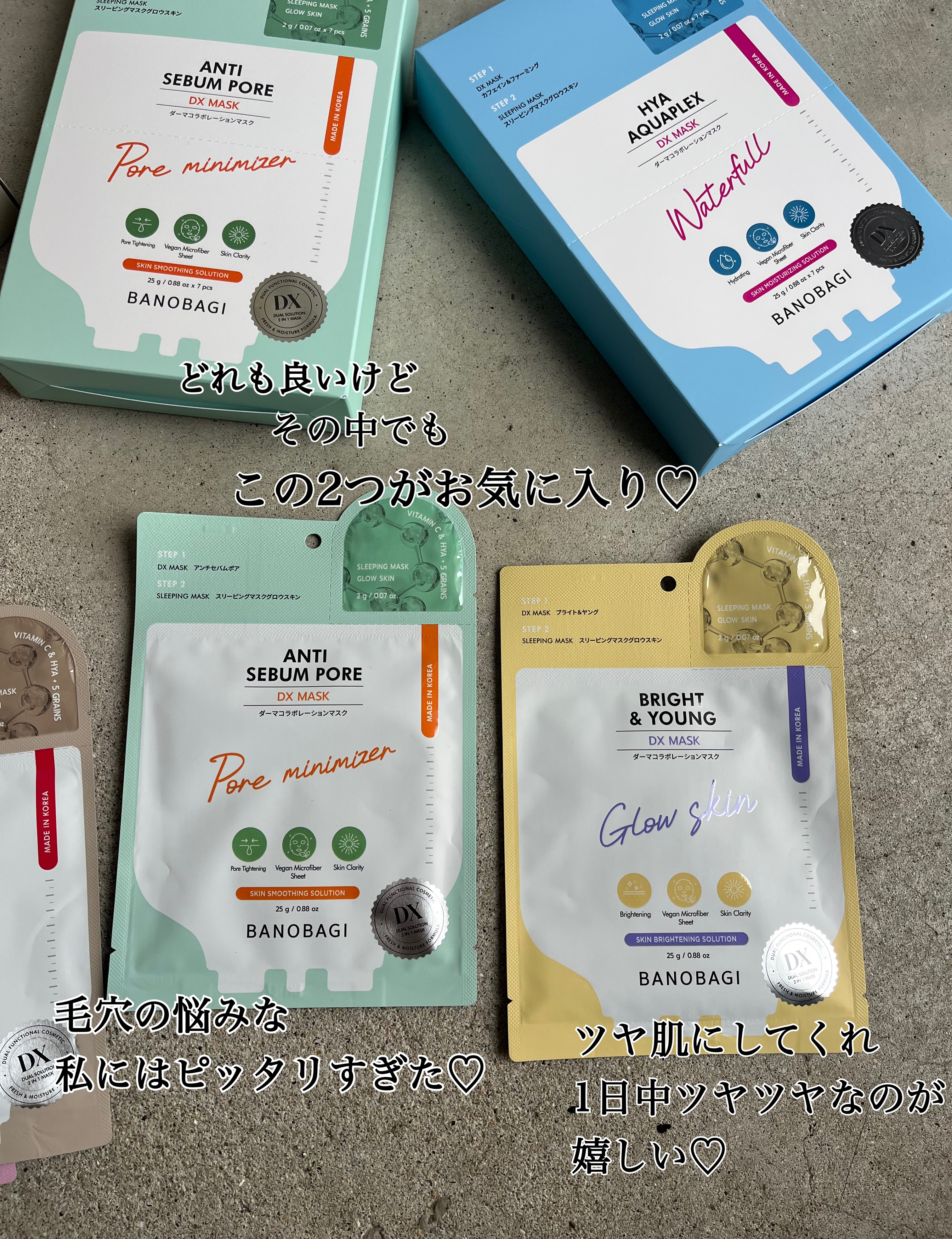 肌悩みに合わせて選べるマスク♡ @banobagi.japan のDXマスクシリーズを使用しました✨ 2in1でこれ1つにフェイスマスクとスリーピングパックが付いているのでこれだけでケア完了しちゃいます✨ ”アンチセボムポア(グリーン)” こちらは毛穴ケアに特化したマスク✨ 広がり毛穴とサヨナラしましょう👋✨ シートはヴィーガン認証完了のもので肌当たりも良くて気持ちよかったです🥹🩷