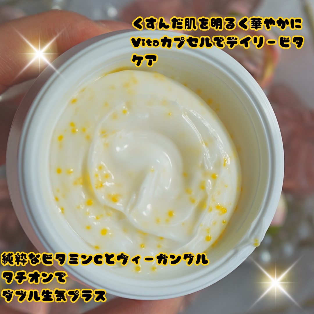 純ビタミンCとビーガングルタチオン配合で、くすんだ肌を明るくしてくれる効果を期待できるクリーム💛 クリームの中に黄色いビタミンカプセルが入ってるよ💊 濃密な水分クリームとビタミンカプセルが素早く吸収され、透明感のある肌を実現してくれるんだって! なめらかなテクスチャーでしっとりつやん肌に✨ 低刺激テスト済み☘️