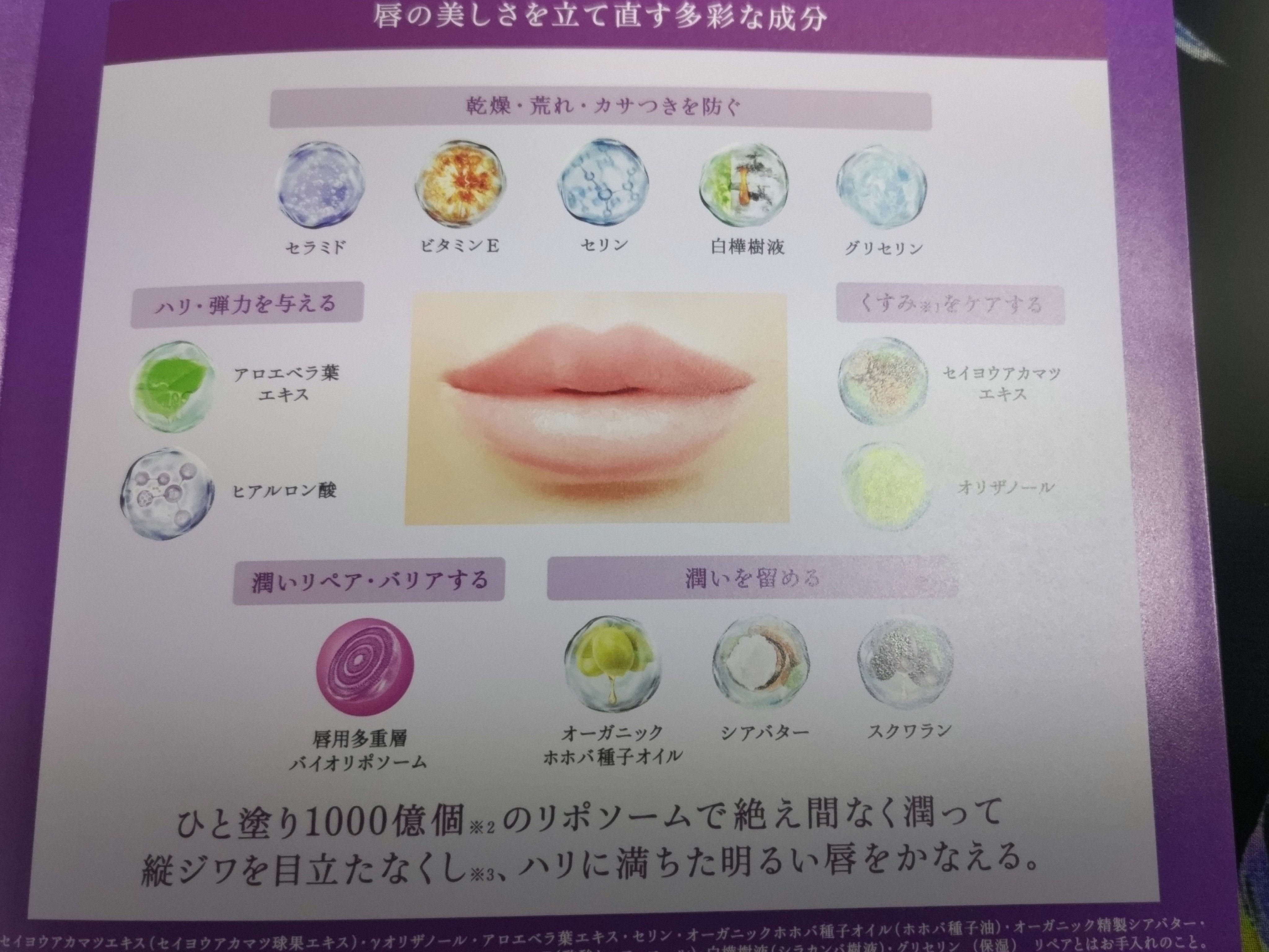 ずっと気になってたからお試しできて嬉しい。夜たっぷりめに塗って起きると朝プルプル。長く潤いが続く感じがします。公式より↓<デリケートな唇のために開発した独自のテクノロジー>Ⅰ.唇用多重層バイオリポソーム約0.1~0.3ミクロンの超微粒子カプセ...