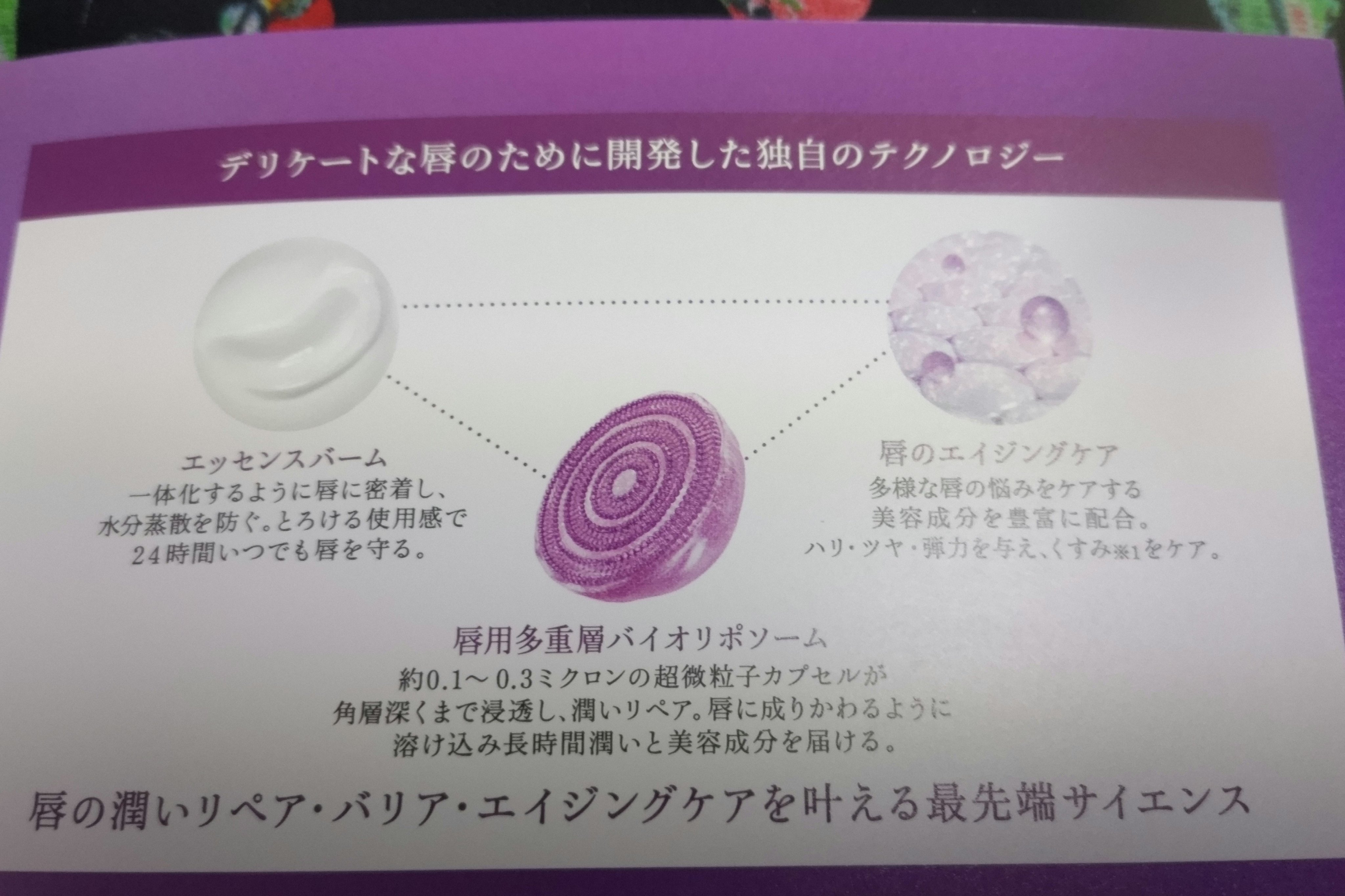- ・口唇の特性を見つめ、新開発した「口唇用多重層バイオリポソーム」を配合した唇本来の美しさを引き出す口唇用美容液です。 生体組成成分リン脂質から成り、たまねぎ状に幾重にも重なる層の中に美容成分を贅沢に抱えたマイクロカプセル、「多重層バイオリポソーム」の構成成分をアレンジし、口唇に対するオリジナルアプローチを叶えました。 ・唇に、ひと塗り1000億個(※5)のリポソーム。 約0.1~0. 3ミクロンの超微細サイズの「口唇用多重層バイオリポソーム」が成りかわるように溶け込み、モイスチュア成分を瞬時に届け、長時間満たします。 ・「口唇用多重層バイオリポソーム」とエッセンスバームの融合で、水分蒸散防止効果と潤いリペア(※6)を叶える独自の処方です。 心地よくやわらかに唇に溶け込み、摩擦や外的刺激、乾燥によるくすみ、あれ、かさつきから守ります。 ・唇をやわらかくし、潤いを閉じ込めるエモリエントオイルや、すみずみまで潤いを与える保湿成分を配合。 ふっくらとしたハリ、弾力を与え、縦ジワも目立たない(※7)、つるんとなめらかでつややかな生き生きと輝く唇へ導き、唇本来の美しさを目覚めさせます 。 ・一日中潤いが持続することで、乾く隙を与えず、乾燥による唇のトラブルを寄せつけません。 ・なめらかなタッチで、体温でとろけるように心地よく唇に溶け込みます。唇と一体化するようになじみ、ベタつきを感じさせません。 ・無着色、無香料、乾燥した唇にも優しくなじむ低刺激処方です。 ・アレルギーテスト済み・パッチテスト済み・スティンギング(皮膚刺激感)テスト済み(※8)、低刺激処方、パラベンフリー、アルコールフリー