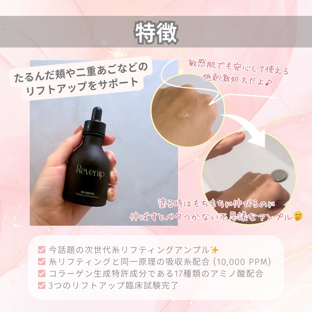 韓国の肌弾力専門ブランド REVENIP(リベニプ)様よりリマージ糸リフティングアンプルをいただきました。リベニプはQoo10へ新しく進出した韓国スキンケアブランド!「崩れない弾力ケア」で肌の黄金期を持続的に維持させるというコンセプトです。 ほのかにフローラルな香りがする透明な美容液です。そしてよくInstagramで見るように糸を引くくらいトロトロなのか……本当にとろっとろ!!とってもお肌に効きそうで魅力的です!
