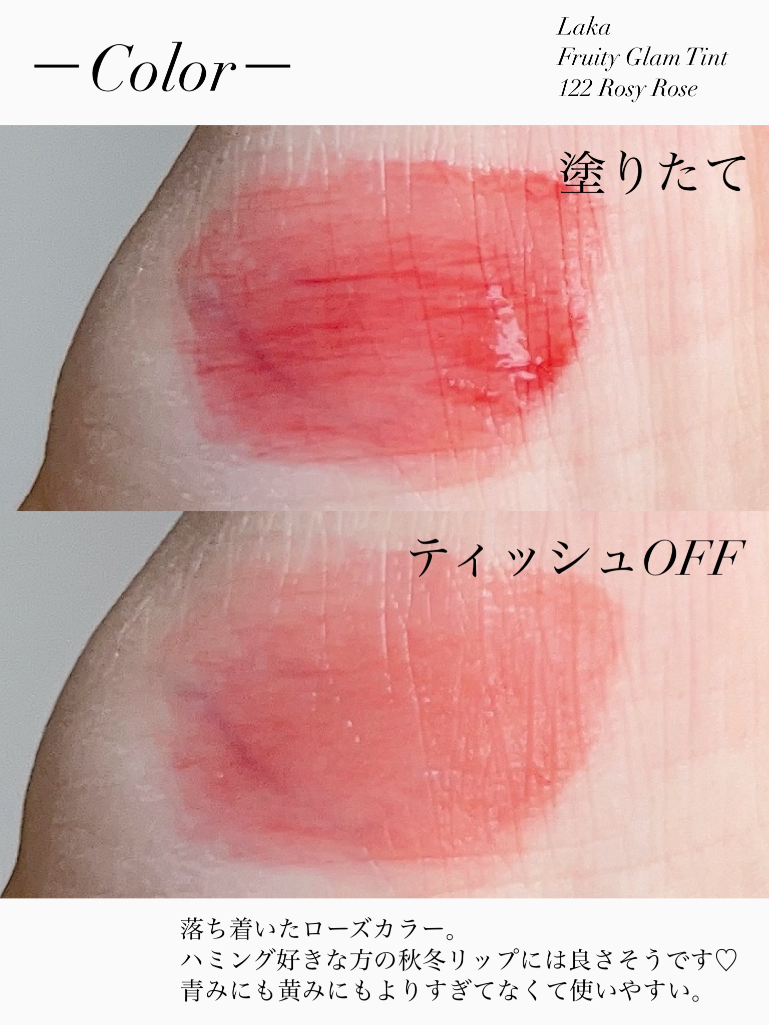Lakaフルーティーグラムティント紹介♡おはようございます☺︎mです♪今回はメガ割で購入した際におまけで頂いたLakaのティントを使用したので、その感想をお届けします♡【使った商品】Laka フルーティーグラムティント【色味】122 ロージー...