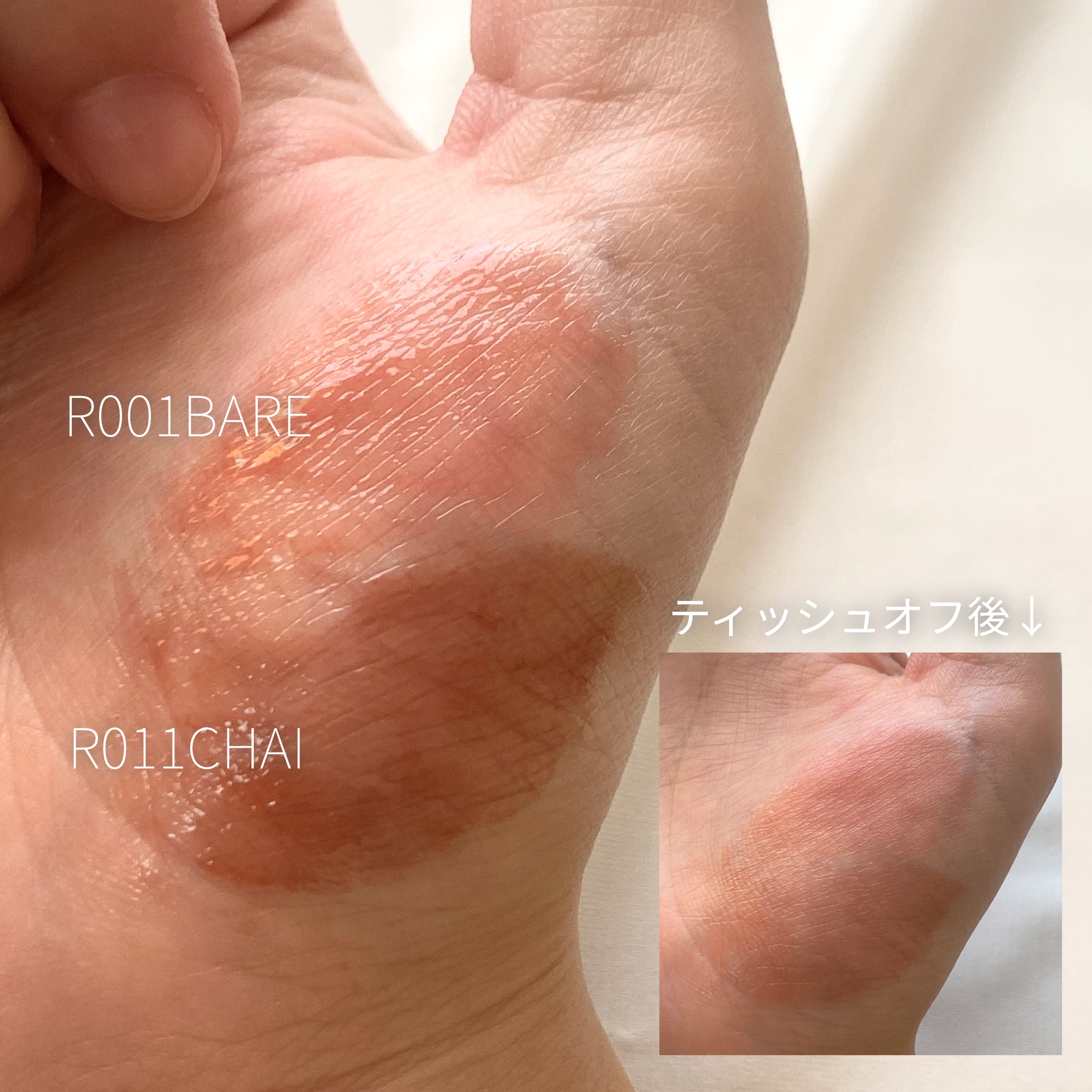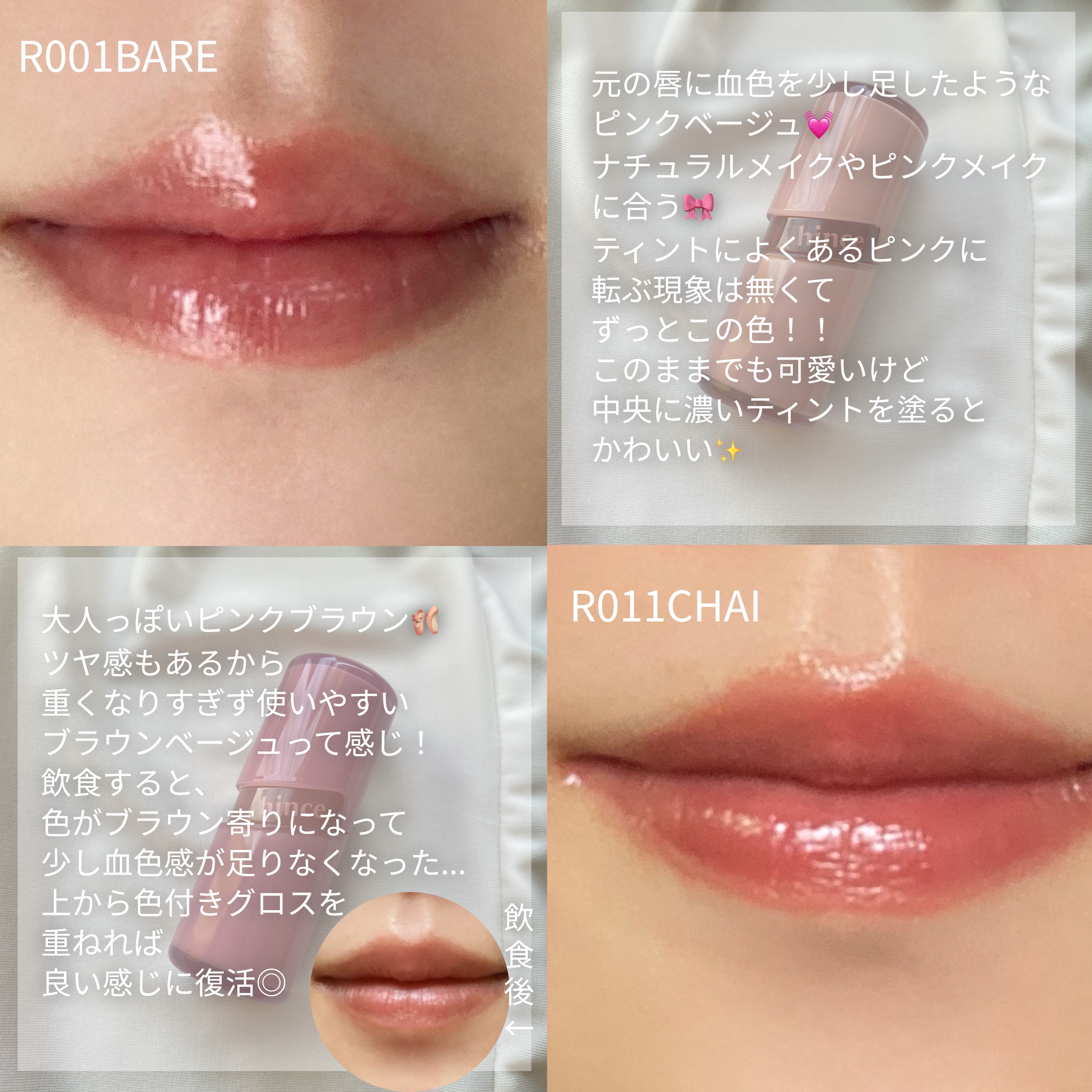 - <R001 ベア> 水、ジフェニルジメチコン、オクチルドデカノール、ビスジグリセリルポリアシルアジペート-2、リンゴ酸ジイソステアリル、トリメチルシロキシフェニルジメチコン、水添ポリイソブテン、ジグリセリン、ポリソルベート60、BG、セチルPEG/PPG-10/1ジメチコン、1,2-ヘキサンジオール、ペンチレングリコール、(アクリル酸ヒドロキシエチル/アクリロイルジメチルタウリンNa)コポリマー、セテアレス-20、スクワラン、フェノキシエタノール、酸化チタン、香料、エチルヘキシルグリセリン、黄5、赤227、イソステアリン酸ソルビタン、水酸化Al、ポリアクリル酸アンモニウム、酢酸トコフェロール、黄4、青1、ヒアルロン酸Na、(アルギニン/リシン)ポリペプチド、加水分解ヒアルロン酸、トコフェロール、アセチルヒアルロン酸Na、ソルビン酸 <R002 ロウローズ> 水、ジフェニルジメチコン、オクチルドデカノール、ビスジグリセリルポリアシルアジペート-2、リンゴ酸ジイソステアリル、トリメチルシロキシフェニルジメチコン、水添ポリイソブテン、ジグリセリン、ポリソルベート60、BG、セチルPEG/PPG-10/1ジメチコン、1,2-ヘキサンジオール、ペンチレングリコール、(アクリル酸ヒドロキシエチル/アクリロイルジメチルタウリンNa)コポリマー、セテアレス-20、スクワラン、フェノキシエタノール、酸化チタン、香料、エチルヘキシルグリセリン、黄5、赤227、イソステアリン酸ソルビタン、酢酸トコフェロール、水酸化Al、ポリアクリル酸アンモニウム、ヒアルロン酸Na、青1、加水分解ヒアルロン酸、(アルギニン/リシン)ポリペプチド、トコフェロール、アセチルヒアルロン酸Na、ソルビン酸 <R003 ロウプリコット> 水、ジフェニルジメチコン、オクチルドデカノール、ビスジグリセリルポリアシルアジペート-2、リンゴ酸ジイソステアリル、トリメチルシロキシフェニルジメチコン、水添ポリイソブテン、ジグリセリン、ポリソルベート60、BG、セチルPEG/PPG-10/1ジメチコン、1,2-ヘキサンジオール、ペンチレングリコール、(アクリル酸ヒドロキシエチル/アクリロイルジメチルタウリンNa)コポリマー、セテアレス-20、スクワラン、フェノキシエタノール、香料、エチルヘキシルグリセリン、酸化チタン、黄5、イソステアリン酸ソルビタン、赤227、酢酸トコフェロール、ヒアルロン酸Na、水酸化Al、ポリアクリル酸アンモニウム、加水分解ヒアルロン酸、青1、(アルギニン/リシン)ポリペプチド、トコフェロール、アセチルヒアルロン酸Na、ソルビン酸 <R004 フィーバー> 水、ジフェニルジメチコン、オクチルドデカノール、リンゴ酸ジイソステアリル、ビスジグリセリルポリアシルアジペート-2、トリメチルシロキシフェニルジメチコン、水添ポリイソブテン、ジグリセリン、ポリソルベート60、BG、セチルPEG/PPG-10/1ジメチコン、1,2-ヘキサンジオール、ペンチレングリコール、(アクリル酸ヒドロキシエチル/アクリロイルジメチルタウリンNa)コポリマー、セテアレス-20、スクワラン、フェノキシエタノール、香料、エチルヘキシルグリセリン、黄5、赤227、イソステアリン酸ソルビタン、酢酸トコフェロール、ヒアルロン酸Na、加水分解ヒアルロン酸、(アルギニン/リシン)ポリペプチド、トコフェロール、アセチルヒアルロン酸Na、ソルビン酸 <R005 ハイビスカス> 水、ジフェニルジメチコン、オクチルドデカノール、ビスジグリセリルポリアシルアジペート-2、リンゴ酸ジイソステアリル、トリメチルシロキシフェニルジメチコン、水添ポリイソブテン、ジグリセリン、ポリソルベート60、BG、セチルPEG/PPG-10/1ジメチコン、1,2-ヘキサンジオール、ペンチレングリコール、アクリル酸ヒドロキシエチル/アクリロイルジメチルタウリンNa)コポリマー、セテアレス-20、スクワラン、フェノキシエタノール、香料、エチルヘキシルグリセリン、赤227、黄5、イソステアリン酸ソルビタン、赤104(1)、酢酸トコフェロール、ヒアルロン酸Na、加水分解ヒアルロン酸、(アルギニン/リシン)ポリペプチド、トコフェロール、アセチルヒアルロン酸Na、ソルビン酸 <R006 ロウグレープ> 水、ジフェニルジメチコン、ビスジグリセリルポリアシルアジペート-2、リンゴ酸ジイソステアリル、オクチルドデカノール、トリメチルシロキシフェニルジメチコン、水添ポリイソブテン、ジグリセリン、ポリソルベート60、BG、セチルPEG/PPG-10/1ジメチコン、1,2-ヘキサンジオール、ペンチレングリコール、(アクリル酸ヒドロキシエチル/アクリロイルジメチルタウリンNa)コポリマー、セテアレス-20、スクワラン、酸化チタン、フェノキシエタノール、香料、エチルヘキシルグリセリン、黄5、赤227、イソステアリン酸ソルビタン、水酸化Al、ポリアクリル酸アンモニウム、酢酸トコフェロール、ヒアルロン酸Na、青1、加水分解ヒアルロン酸、(アルギニン/リシン)ポリペプチド、トコフェロール、アセチルヒアルロン酸Na、ソルビン酸 <R007 チル> 水、ジフェニルジメチコン、オクチルドデカノール、ビスジ