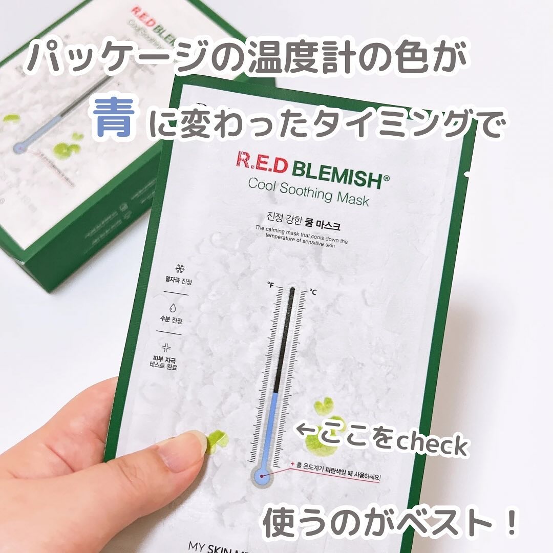 美容液は糸を引くくらいの粘度あるテクスチャー。シート生地は極薄ですが美容液がたっぷり入っているのでお肌にピタッと密着してくれます。 使用前に冷蔵庫保管して袋の温度計の絵が青くなったタイミングで使用すると効果的みたい。 5種類のシカ成分と5種類のヒアルロン酸で肌トラブルの鎮静だけでなく水分ケアもできるそう。
