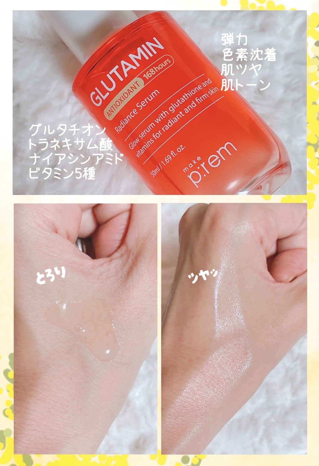 暗い肌トーン、肌の弾力、色素沈着の3大悩みに! グルタチオン&ビタミンの最強組み合わせで肌のツヤ、弾力をケアし白玉ツヤ肌に導いてくれるよ✨ とろみのあるけど、みずみずしいテクスチャーで、べたつかず肌に馴染み、つやっとした肌に✨ 朝のメイク前にも使いやすいです! ぜひチェックしてみてくださいね💕