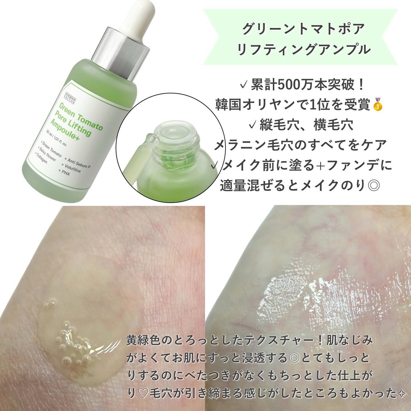 成分エディターグリーントマトポアリフティングアンプル縦毛穴、横毛穴、メラニン毛穴の気になる3種の毛穴にアプローチ!毛穴が気になっている方におすすめなアンプル😊低刺激テスト済みで朝も夜も使用可能!とろみがあるテクスチャーのアンプルを満べんなく塗...