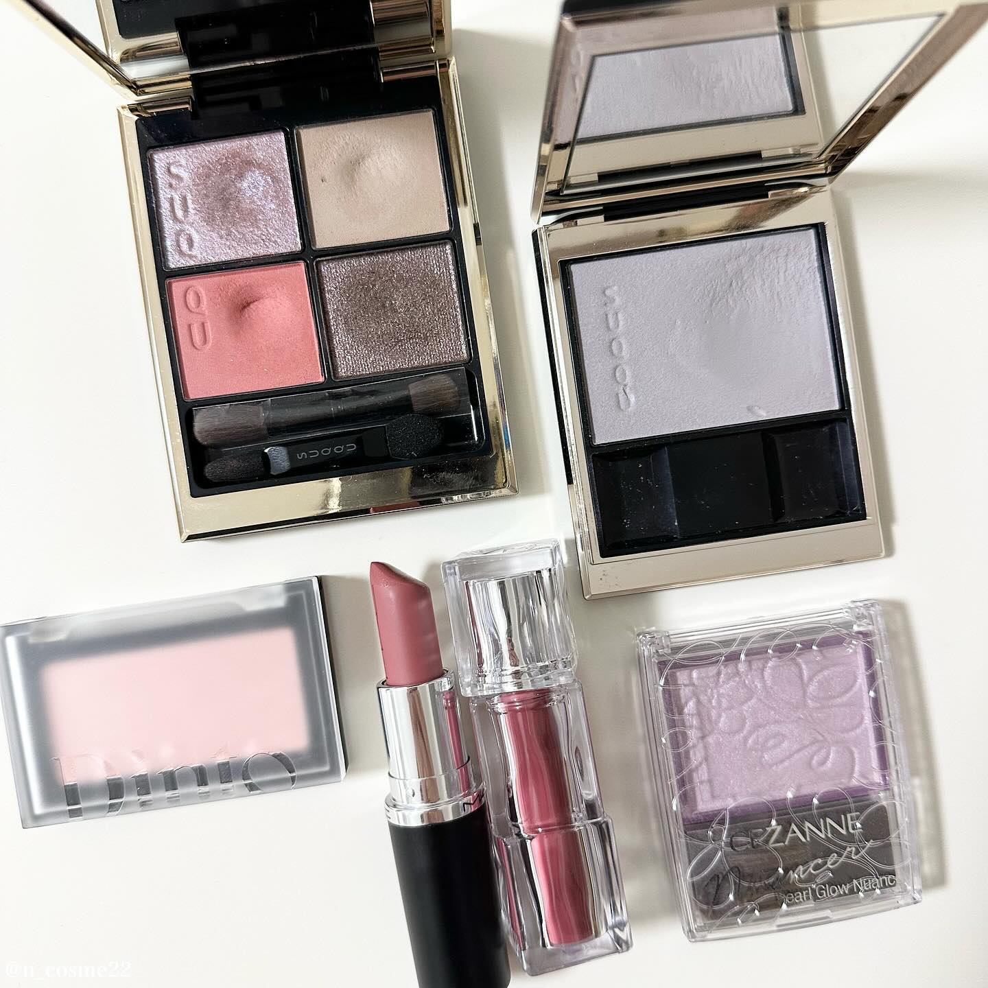アイシャドウは実物の方が相当可愛い! 特に左上のラメの破壊力、、、 左側ボルドーは本当にふんわりと。 その上から右側のライラック?ピンクを 乗せると透明感爆発でした🥹👏🏻 本当にSUQQUは裏切らない可愛さ。 4月に発売されるもう一色のシグニチャーも、 5月発売のサマーもしっかり買うよ☺️❤️🔥