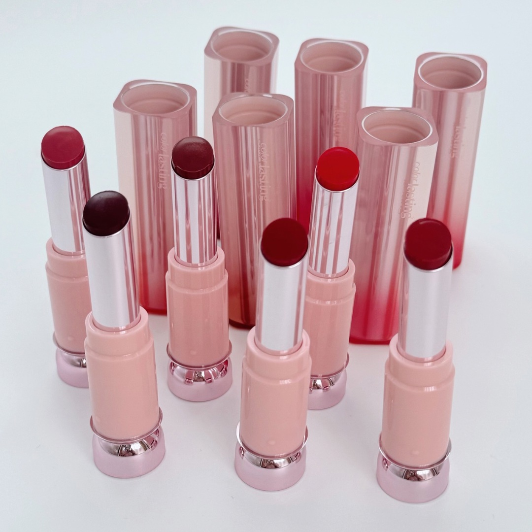 ETUDEから新作リップが出たよー🥰💄✨カラーラスティンググロウスティック6色をスウォッチ🌸ETUDEエチュードカラーラスティンググロウスティックいちごローズ/永遠ルビー/やきもちレッド/ピンクの願い/はちみつベージュ/夜明けモーヴ唇にするす...
