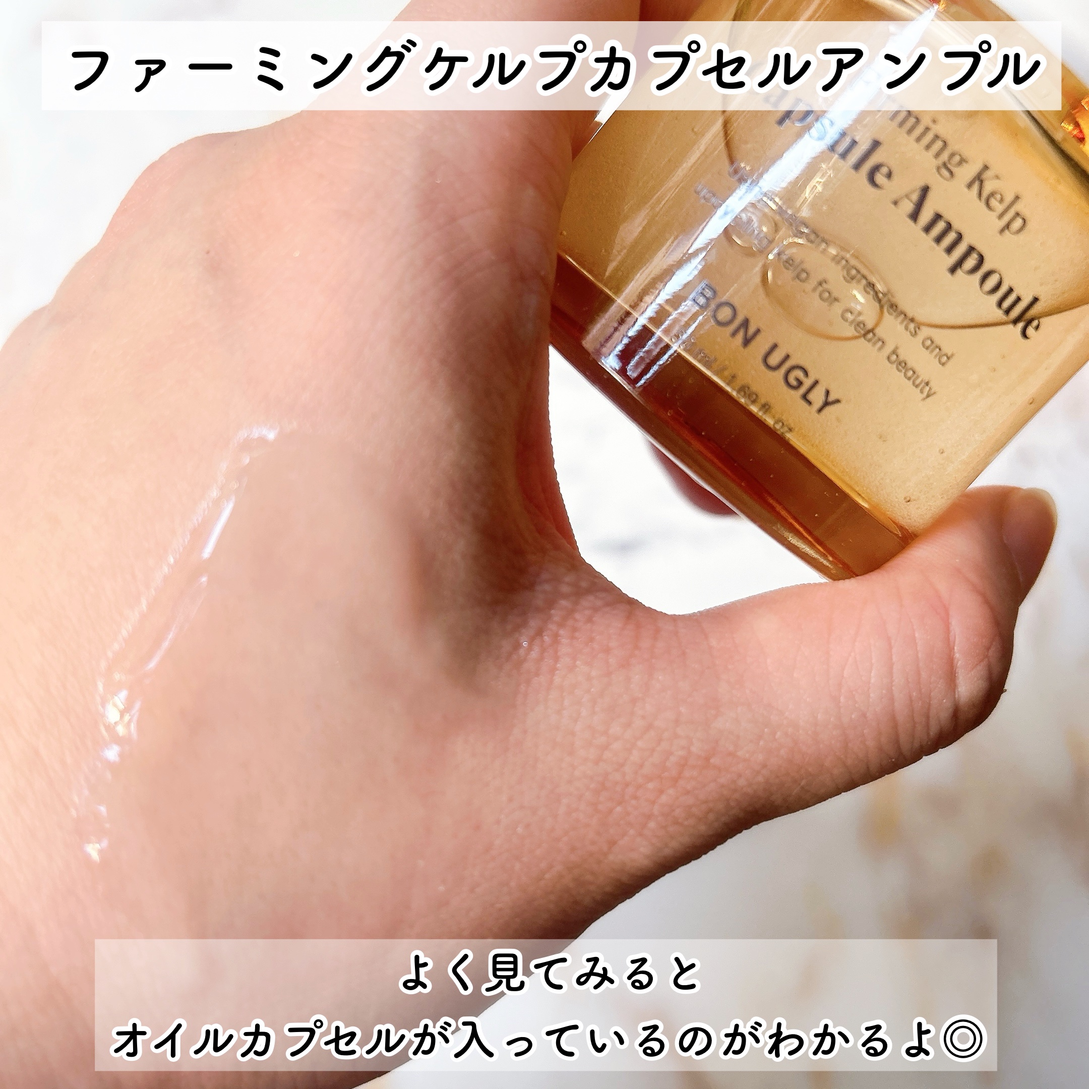 韓国のファへアワード第1位受賞した BON UGLY (ボンアグリー)ファーミングケルプカプセルアンプル50mlを使ってみたよ💖 光に透かしてよく見ると、小さいカプセルのようなつぶつぶしたものが見えます。こちらのカプセルは使うときに弾ける。抗酸化オイルカプセル✨ ニンジンから抽出した植物由来コラーゲン保湿因子が お肌の水分量を高めて弾力性を維持して細胞に栄養成分を補給してコラーゲンとエラスチンの生成を促進するそう