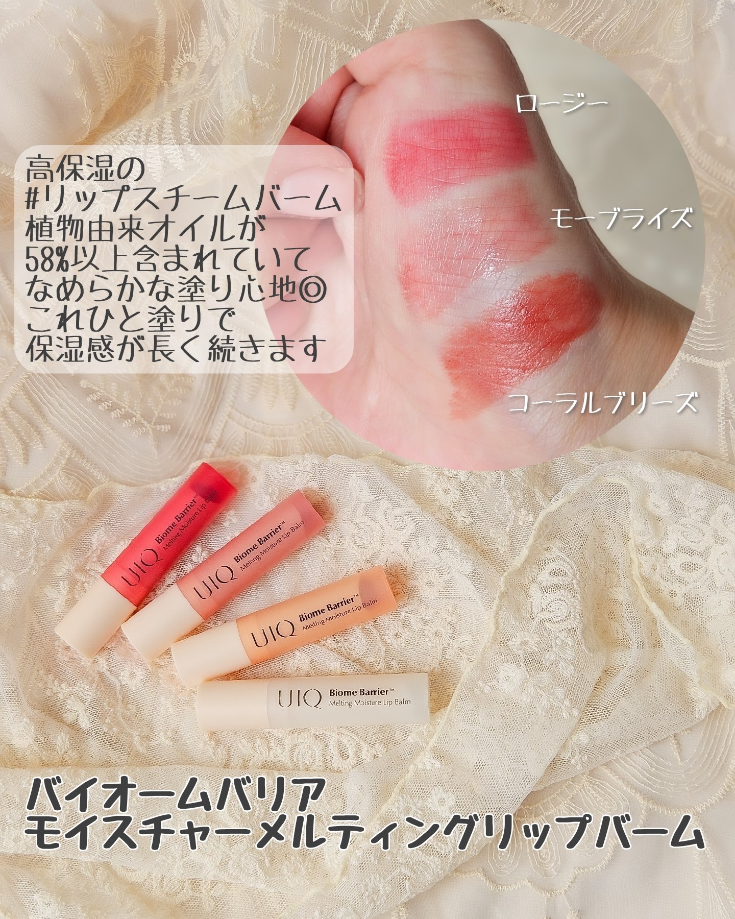 バイオームバリアモイスチャーメルティングリップバーム 一言で表すと色付きリップ💄 保湿感はもちろん、色展開がとても可愛い💕 モーブライズとコーラルブリーズが新色✨ どれも自然な発色で使いやすいけど、わたしの1番の推しカラーはモーブライズ🥰 植物由来成分56%以上配合で、よりマイルドな使い心地を追求されているそう💡